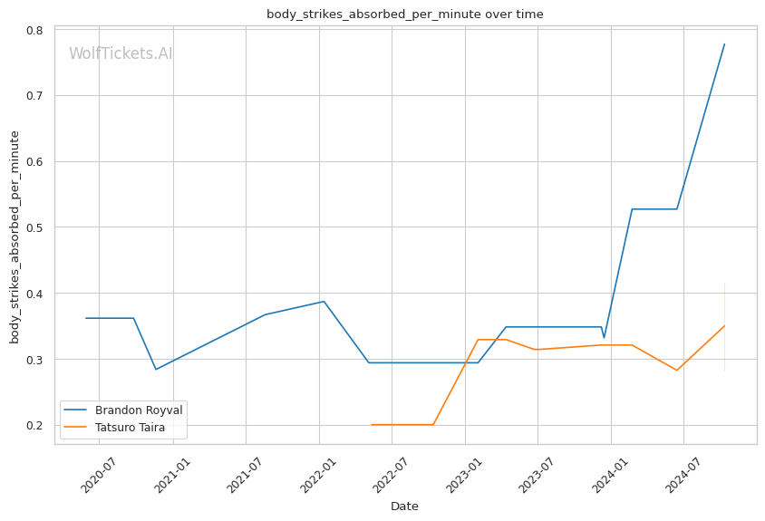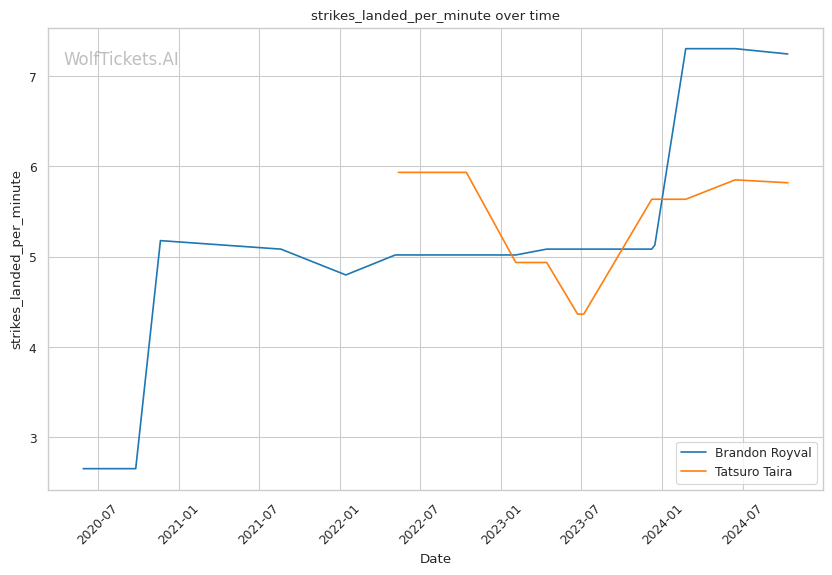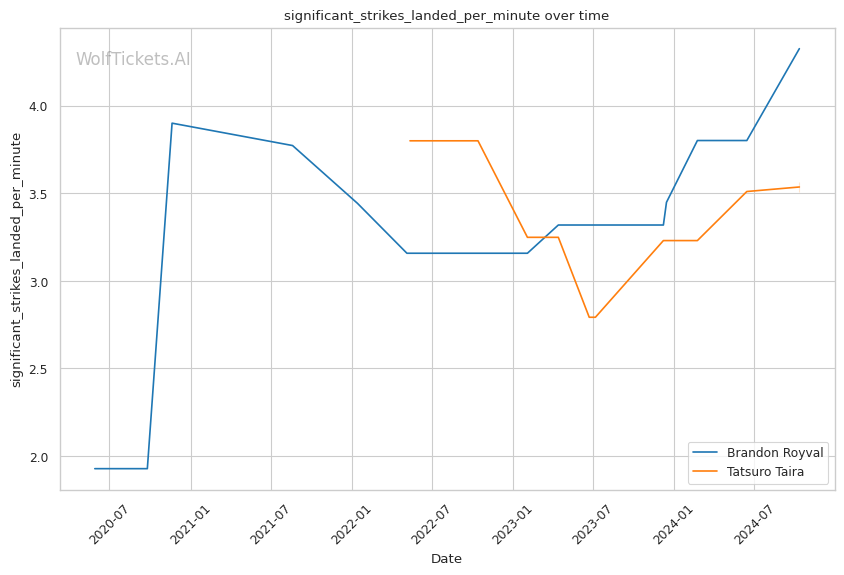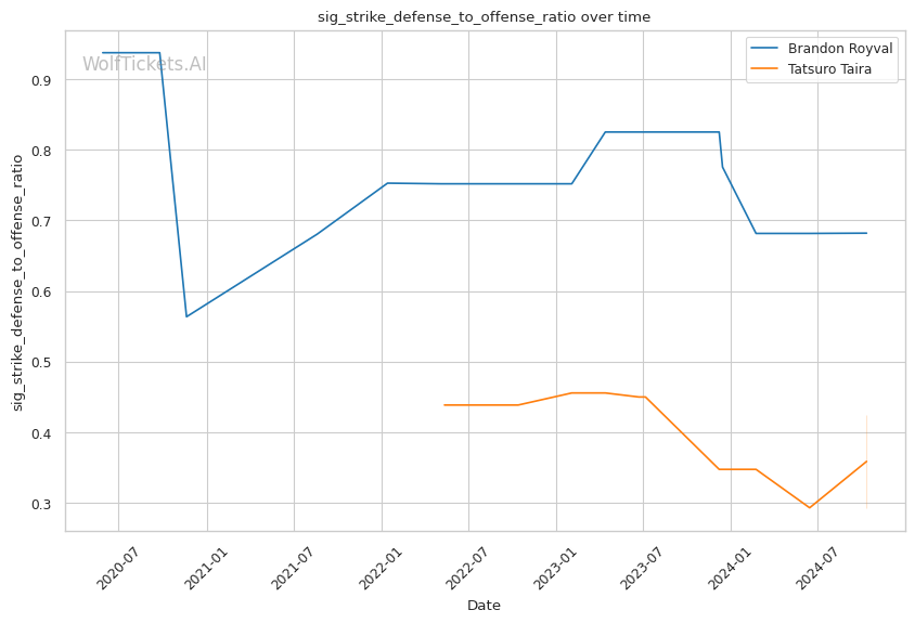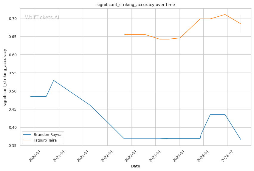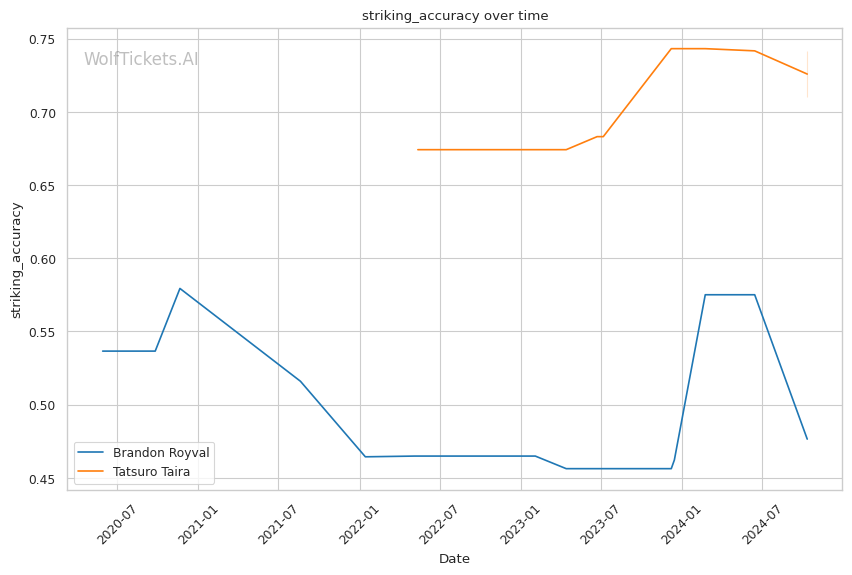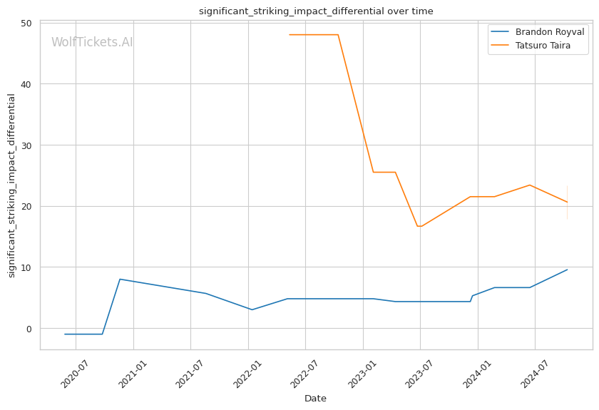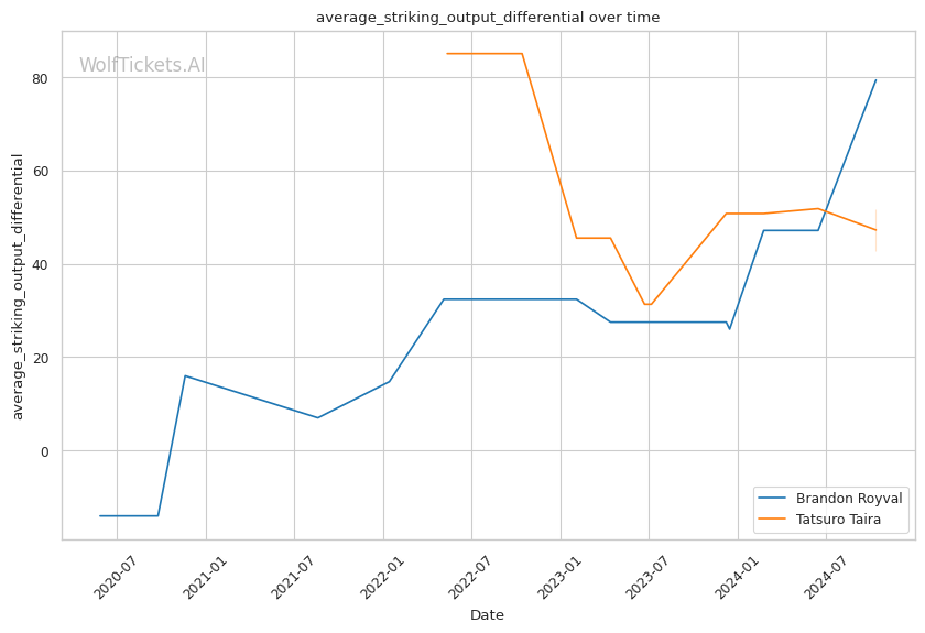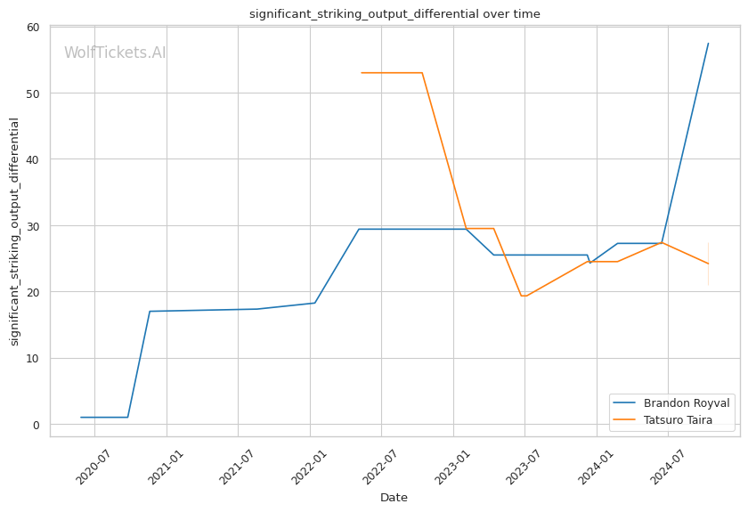 Striking Differentials: Taira holds the advantage in both overall and significant striking differentials, indicating that he tends to outstrike his opponents more consistently than Royval.