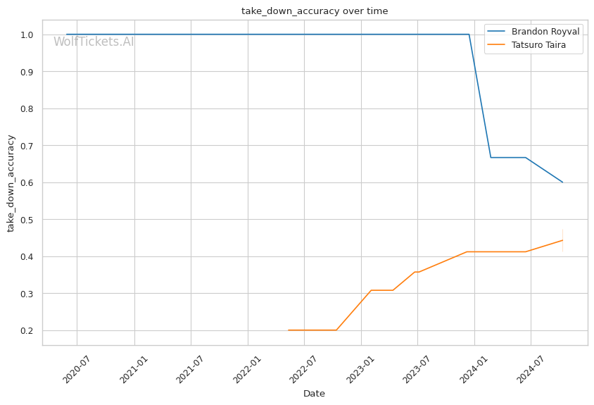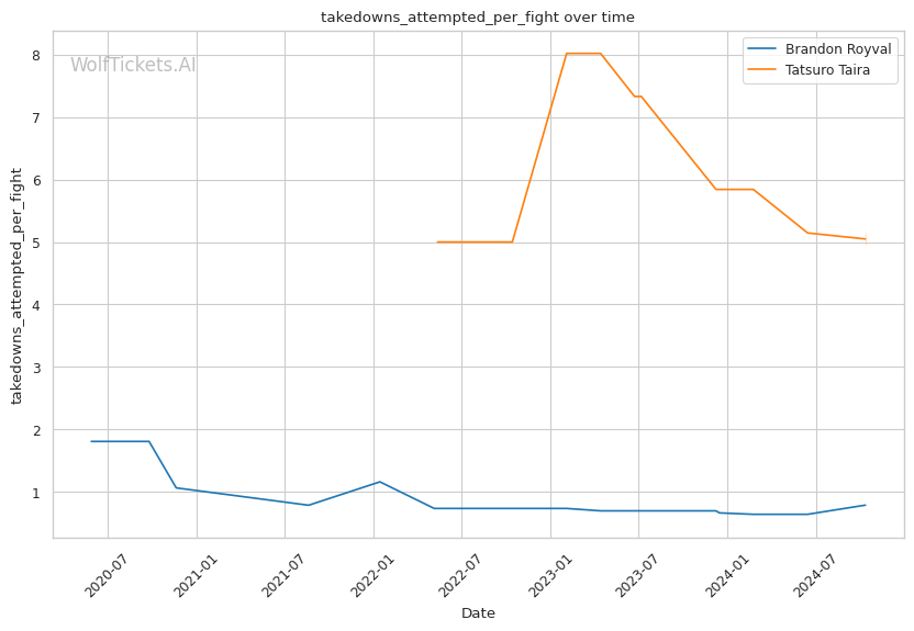Grappling Stats: Taira's superior takedown accuracy (47.6% vs 60%) and submission rate (2.66 vs 1.80 per fight) in recent fights suggest that he will likely have the grappling edge over Royval.