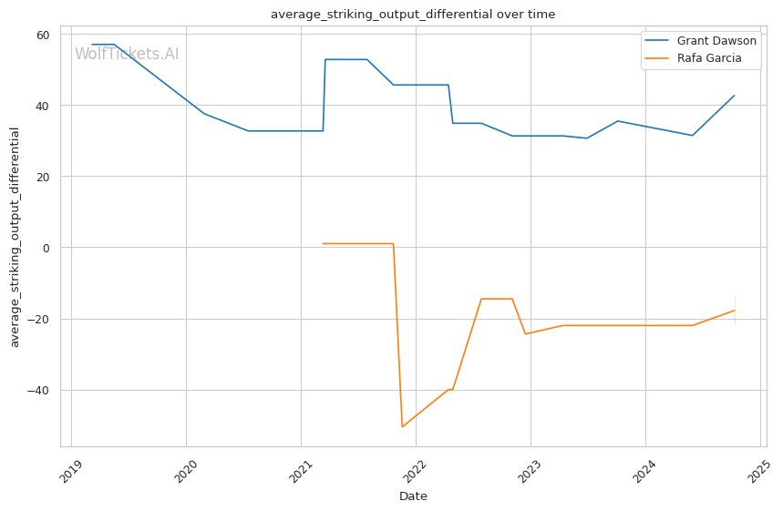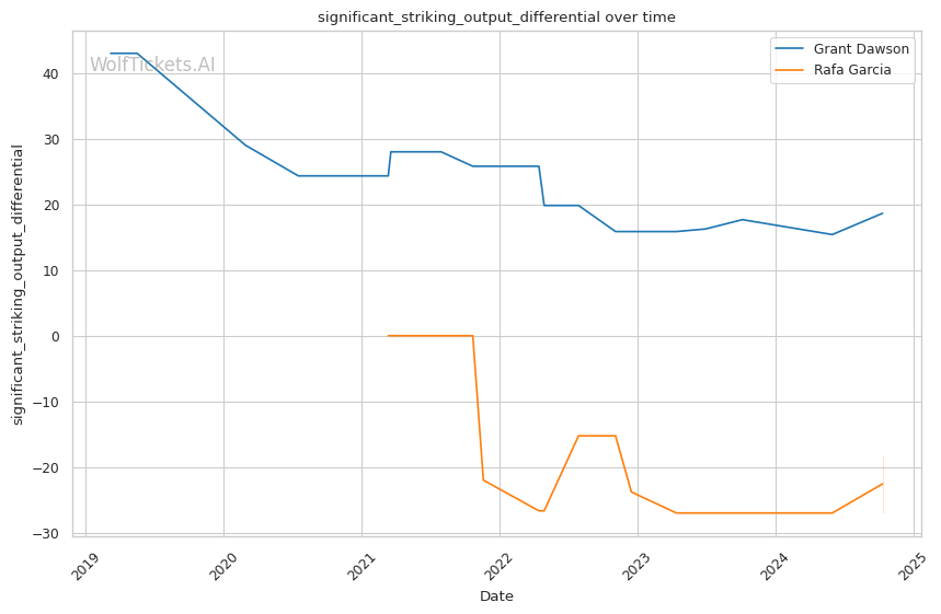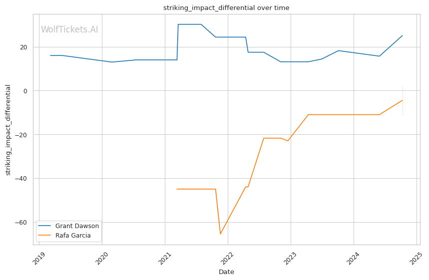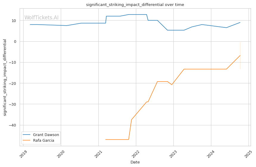 Recent Significant Striking Impact Differential: This measures the difference between significant strikes landed and absorbed. It increased the prediction score by 2.0, favoring Dawson. Dawson lands more significant strikes compared to what he absorbs, giving him an edge.