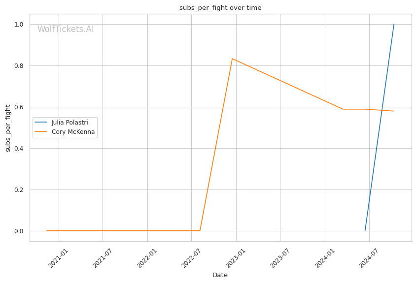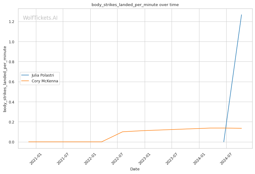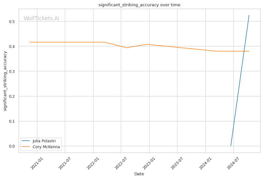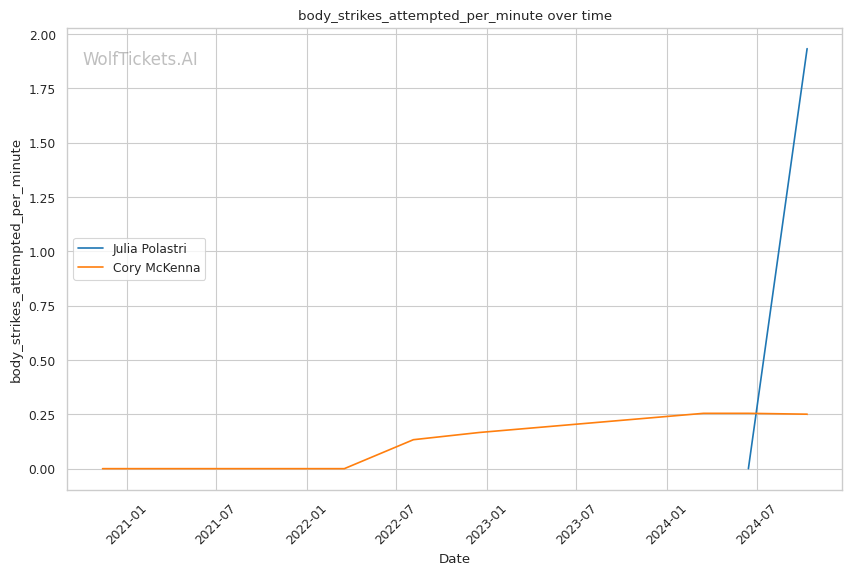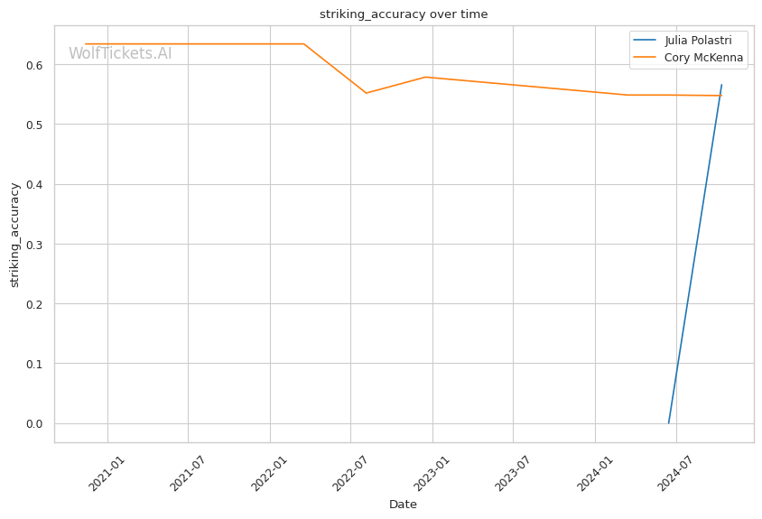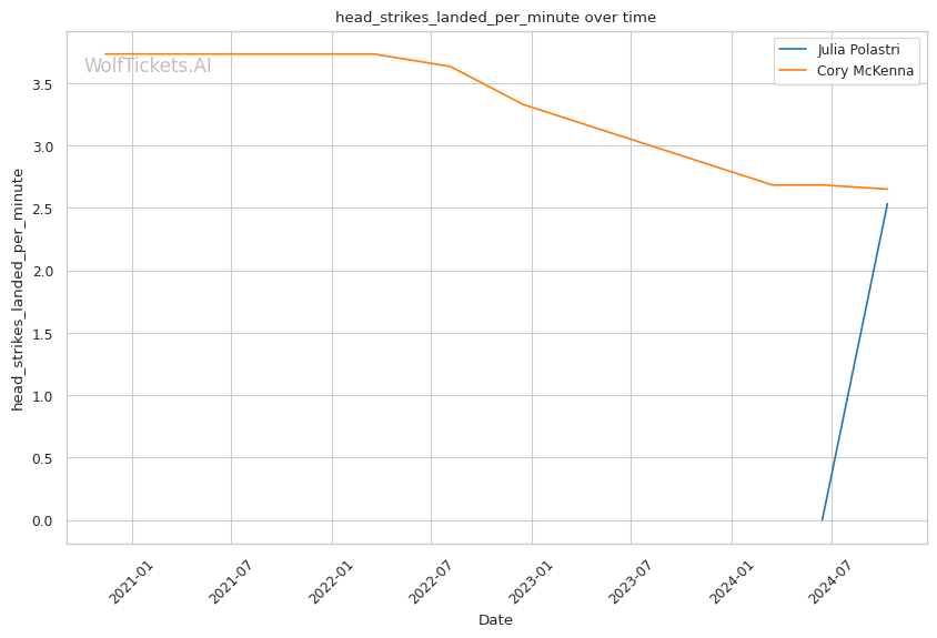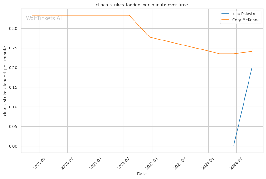 With a purple belt in Brazilian Jiu-Jitsu, McKenna has demonstrated solid ground skills. She notably secured a historic Von Flue choke victory in the UFC, demonstrating her ability to capitalize on unconventional opportunities. McKenna lands 2.96 significant strikes per minute at 37.96% accuracy while absorbing 2.22 strikes per minute. Her striking defense (47.11%) is slightly better than Polastri's (49.18%).