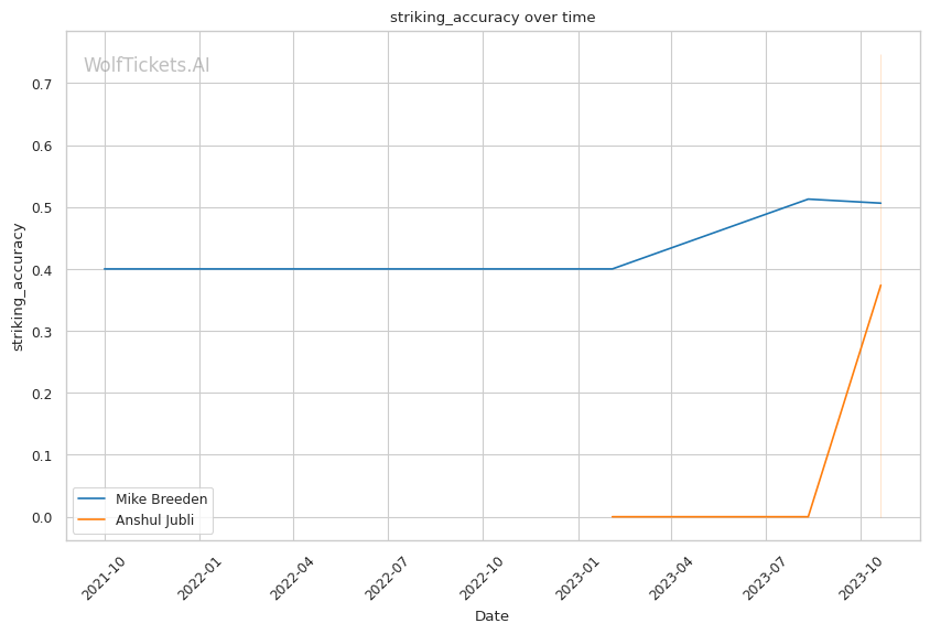 WolfTicketsAI has predicted Anshul Jubli to defeat Mike Breeden, which is a reasonable pick given the data. Jubli is undefeated with 7 wins and no losses or no contests. He has finished every UFC fight by KO/TKO showing dangerous striking accuracy, power, and defense. His striking stats are far superior to Breeden's in accuracy and impact. Breeden is on a 3 fight losing skid with 2 by KO/TKO which is concerning for his chin and Wolftickets likely factored this recent poor stretch into their prediction. Breeden does have more MMA experience but his 10-6 record shows inconsistency. Coming off 2 bad KO losses and facing a surging finisher like Jubli spells trouble for Breeden. The betting odds confirm Anshul Jubli as a heavy favorite. Look for the King of Lions to continue his reign of terror against the outmatched Money Breeden.