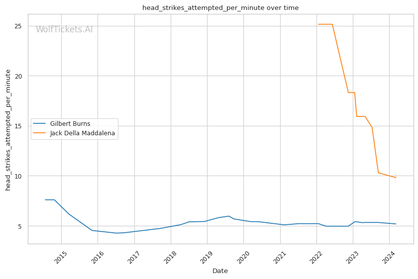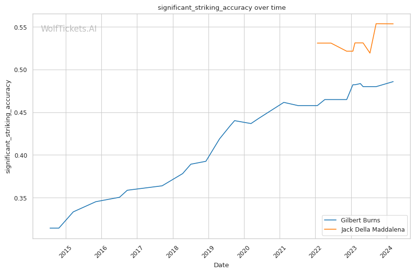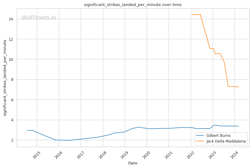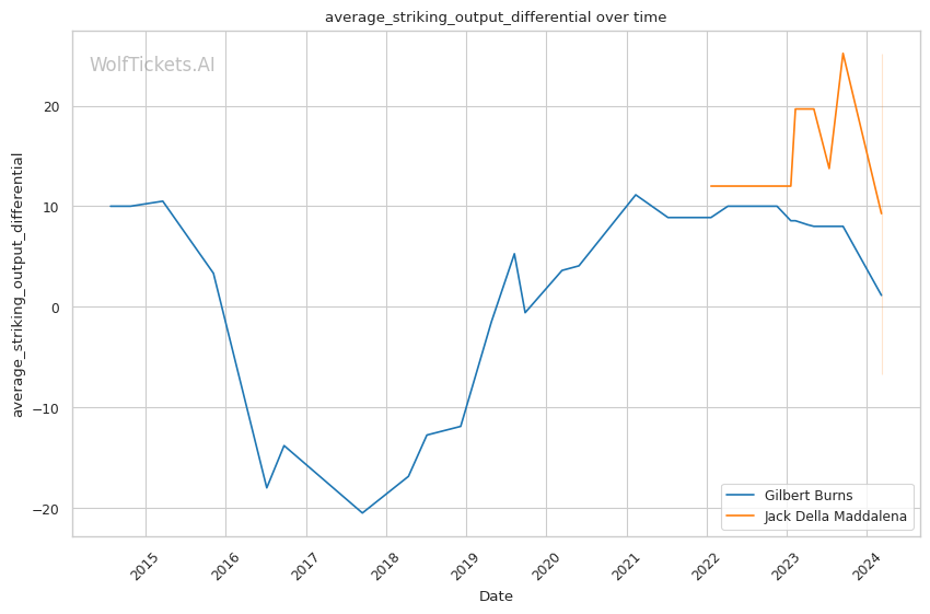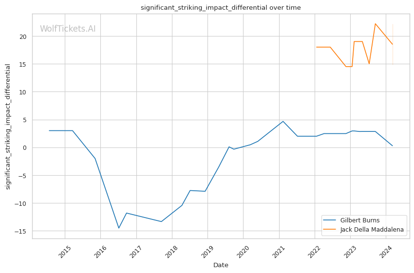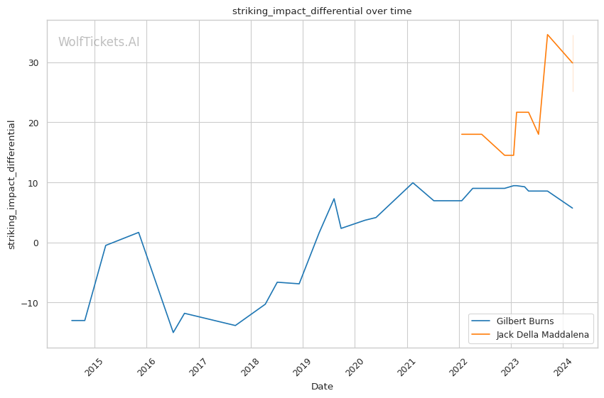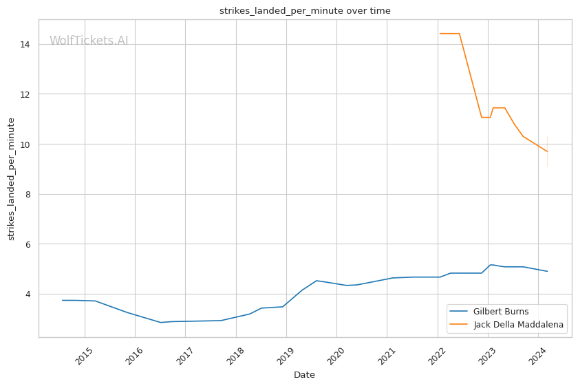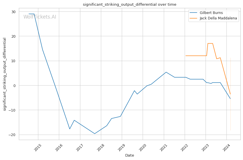 Della Maddalena also has advantages in significant striking differential stats. He lands 8.87 significant strikes per minute, compared to just 3.72 for Burns recently. This gap in striking volume and efficiency is important.