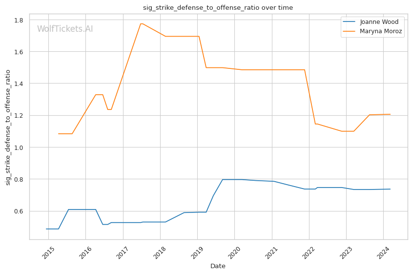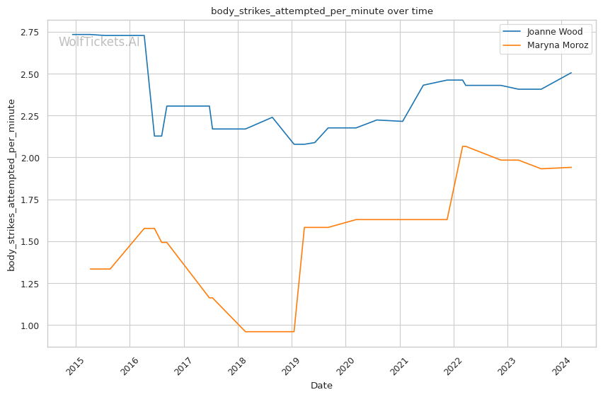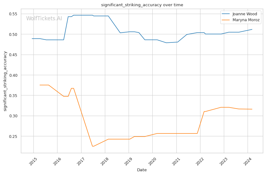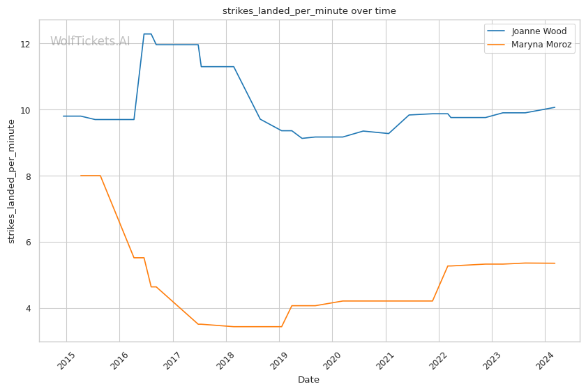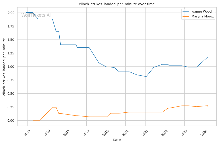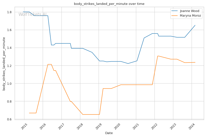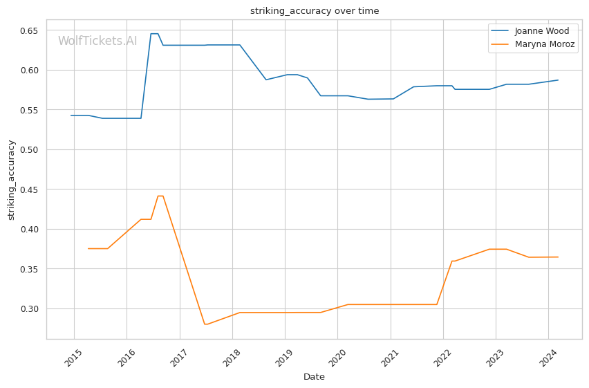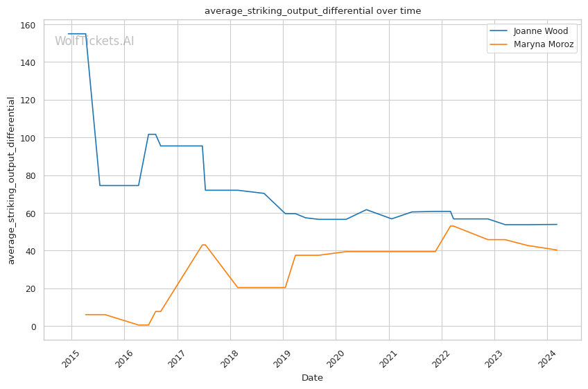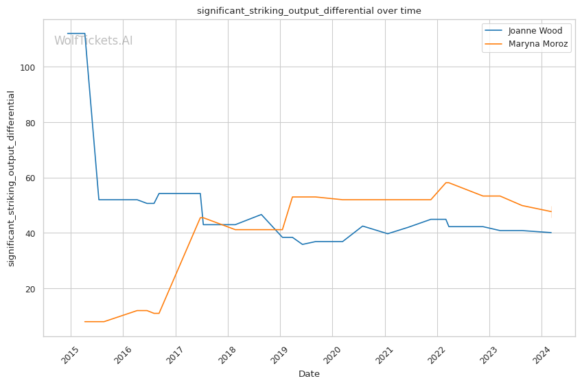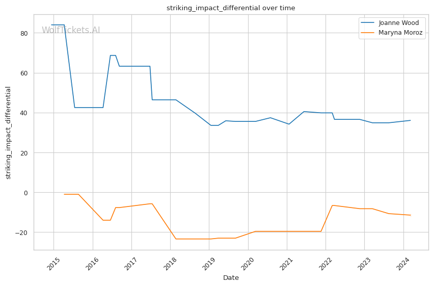 WolfTicketsAI bases its prediction on key metrics such as the "Significant Striking Impact Differential," favoring Joanne Wood due to her superior ability to land impactful strikes compared to Moroz. Wood's advantageous odds and TrueSkill metrics further support the prediction, suggesting her striking precision and defensive tactics might counterbalance Moroz's aggressive style.