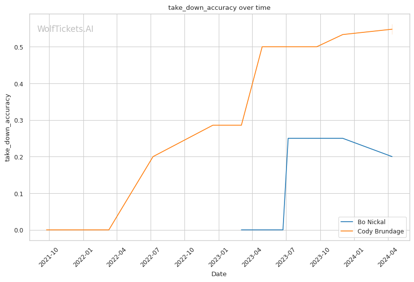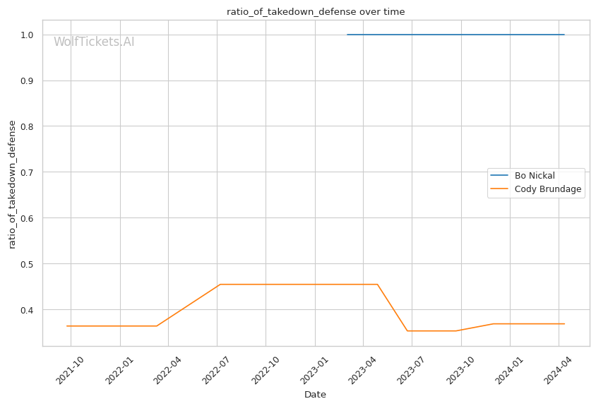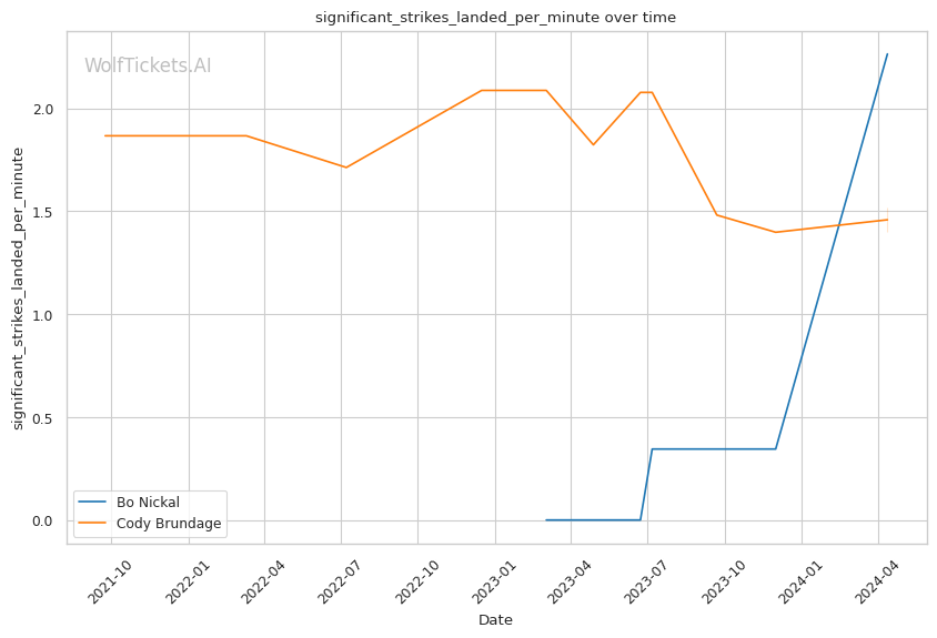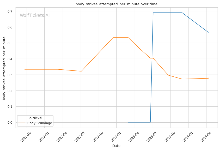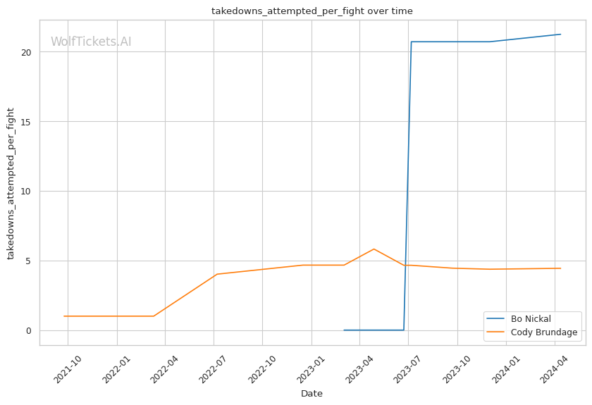 Recent Takedowns Attempted per Fight: Bo Nickal has a much higher rate of takedowns attempted per fight compared to Cody Brundage. This aligns with Nickal's wrestling-heavy approach and could be a key factor in the fight.