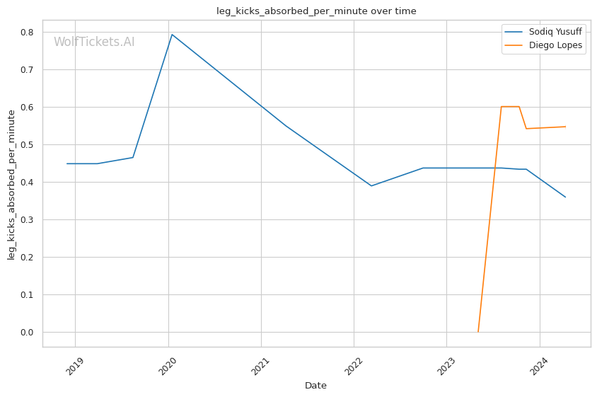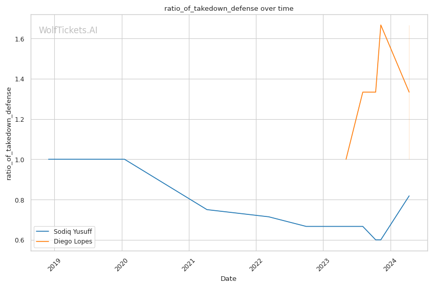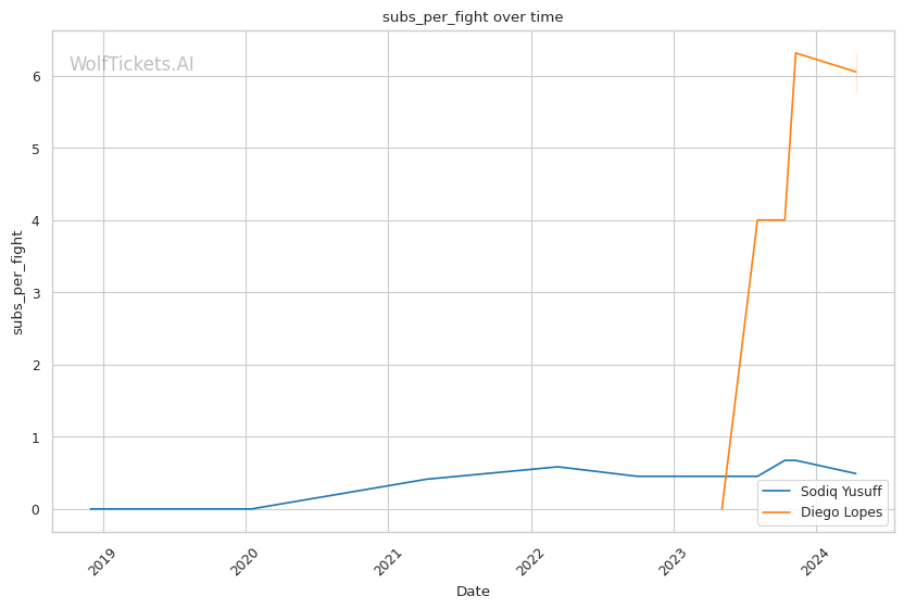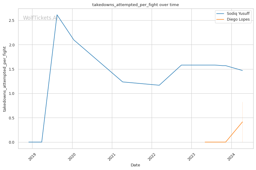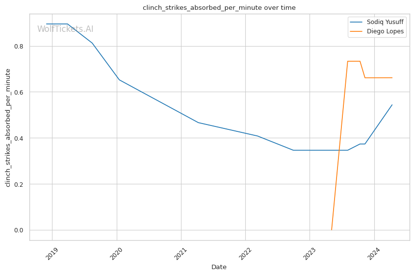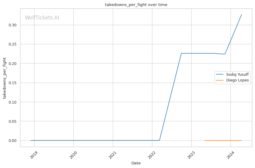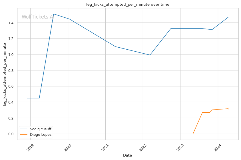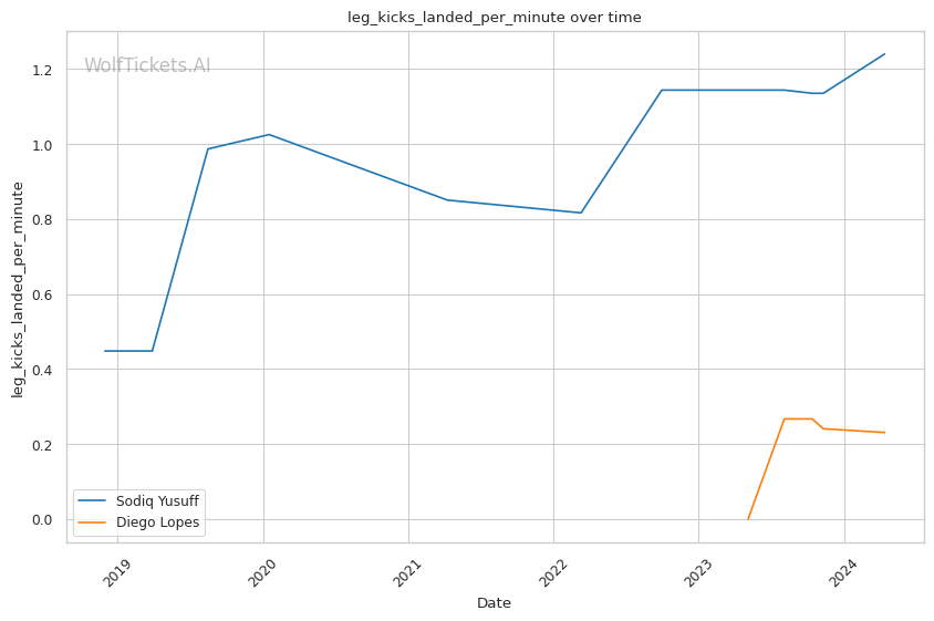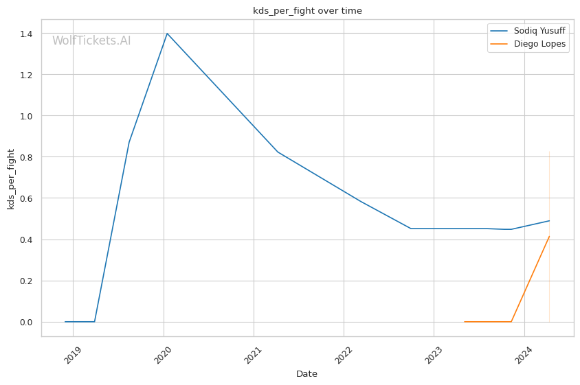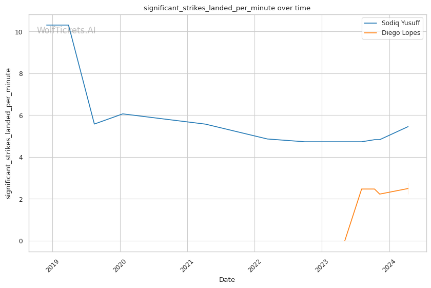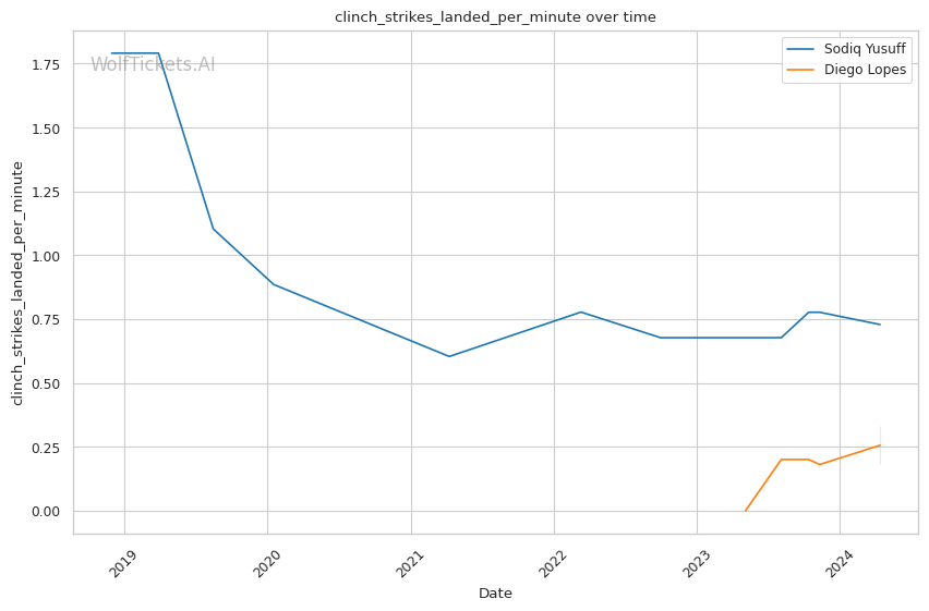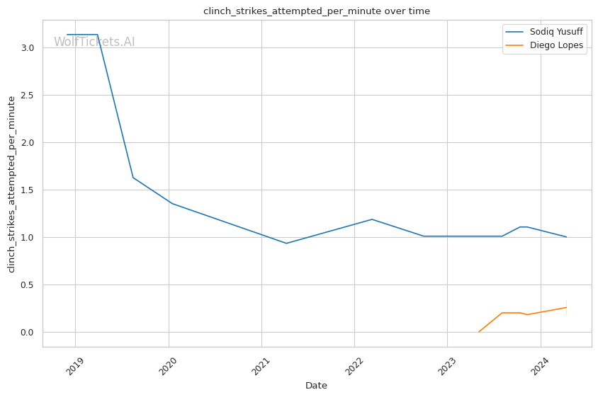 Lopes is a submission specialist, averaging an astounding 5.79 submissions per fight. He is constantly hunting for submissions, making him a threat on the ground. His striking, while not as refined as Yusuff's, is still effective, landing 2.76 significant strikes per minute with a 54.95% accuracy.