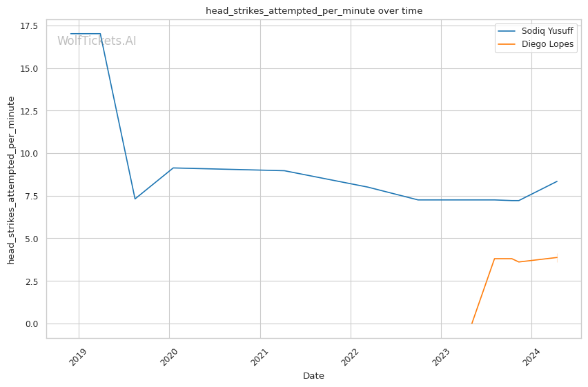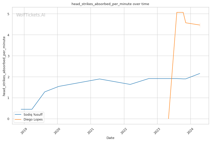 However, Lopes' striking defense is a concern, with a low 35.37% significant strike defense percentage. He absorbs 4.36 head strikes per minute, which could be problematic against a precise striker like Yusuff. Additionally, Lopes has yet to secure a takedown in the UFC, which may limit his ability to implement his grappling game.