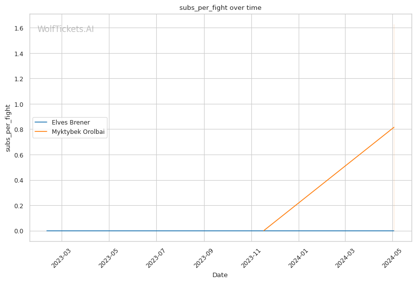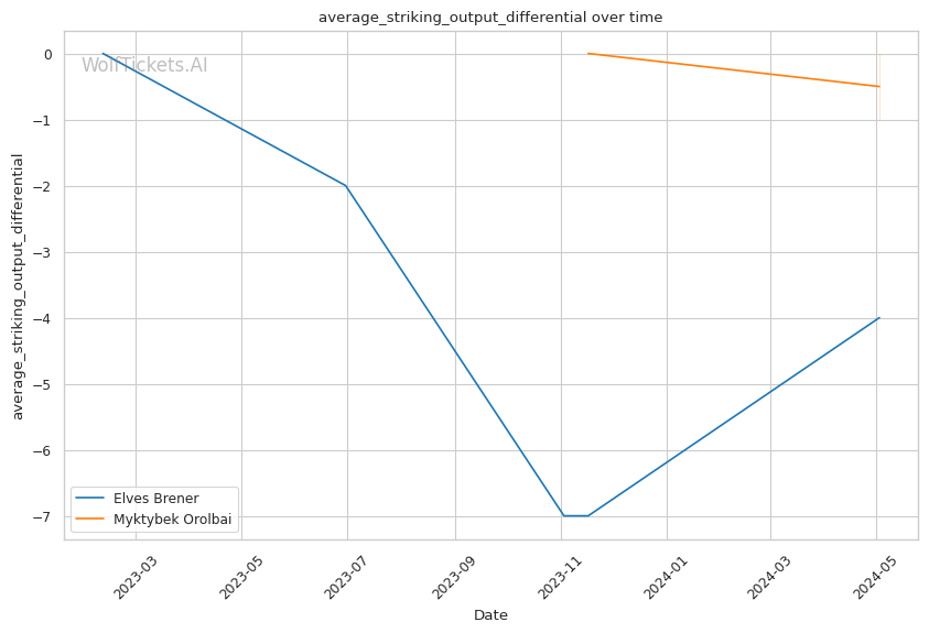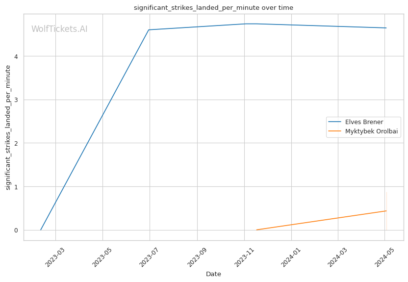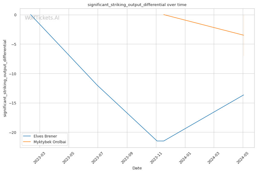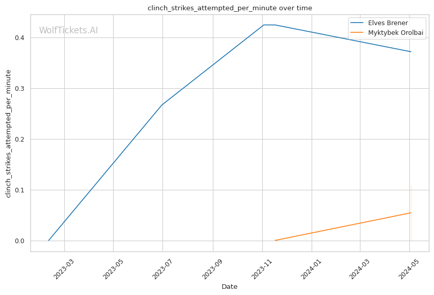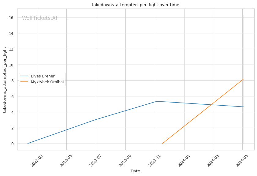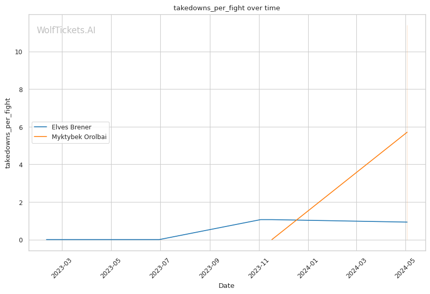 In this classic grappler vs striker matchup, Myktybek Orolbai's grappling prowess is expected to neutralize Elves Brener's striking game. Orolbai's high volume of takedown attempts and submission average suggest he will persistently pursue the fight on the ground. However, Brener's recent KO/TKO victories and striking accuracy make him a dangerous opponent on the feet.