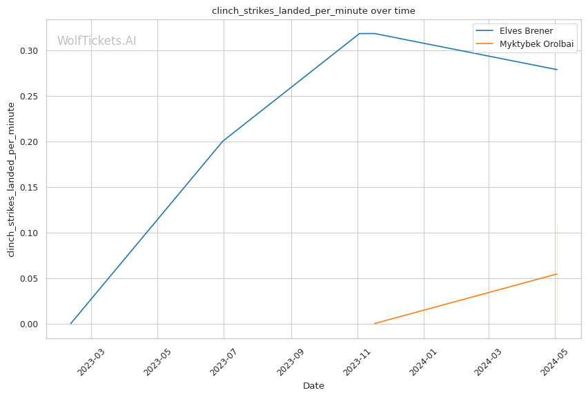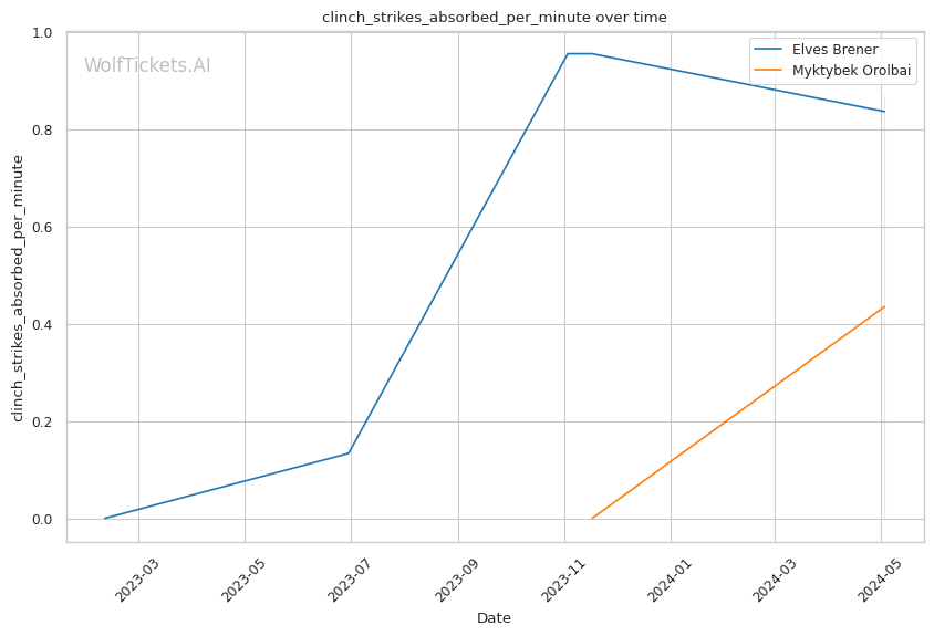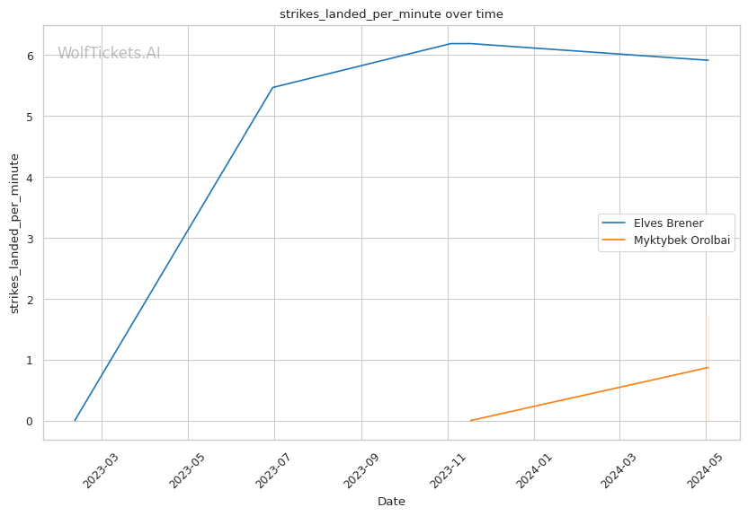 Brener's striking game is well-rounded, with a mix of head strikes (2.41 per minute), body strikes (1.24 per minute), and leg kicks (0.99 per minute). His striking accuracy stands at 51.9%, and he lands an impressive 5.91 strikes per minute.