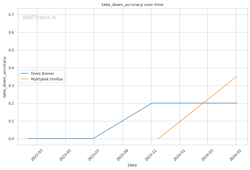 Orolbai's grappling-heavy approach is evident in his striking stats, landing only 1.74 strikes per minute, with a focus on head strikes (0.65 per minute). However, his takedown accuracy is an impressive 70%, and he attempts 16.30 takedowns per fight, making him a constant threat on the ground.