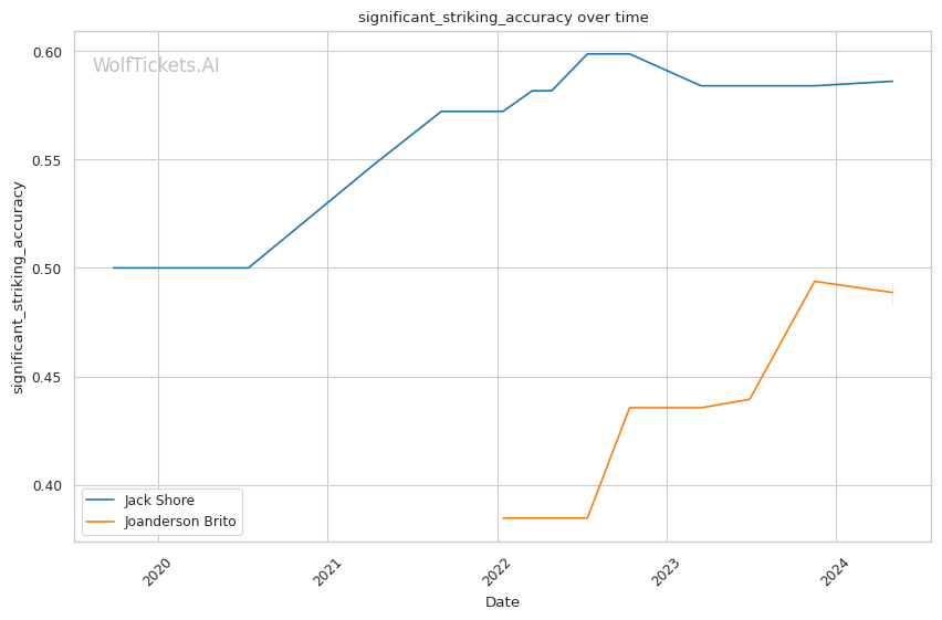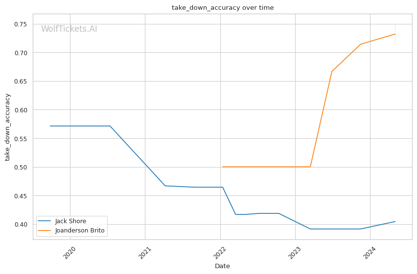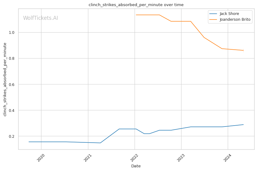 Striking Defense Percentage: Shore absorbs less significant strikes, with a 50% defense percentage compared to just 30% for Brito. Shore is better at avoiding damage.