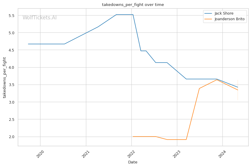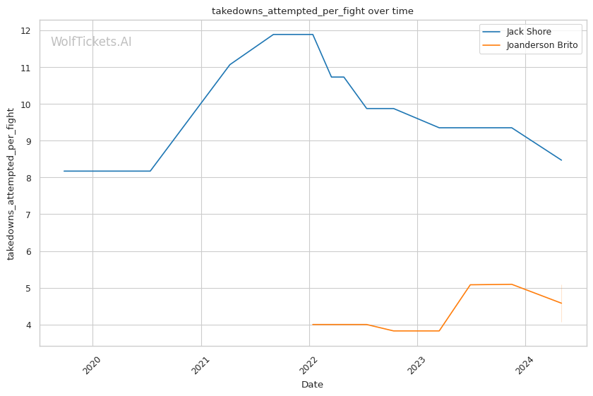 Recent Takedowns Attempted per Fight: This feature favors Shore, who attempts 10.15 takedowns per fight in his last 3 bouts compared to just 5.22 for Brito. Shore's wrestling could be a key factor.