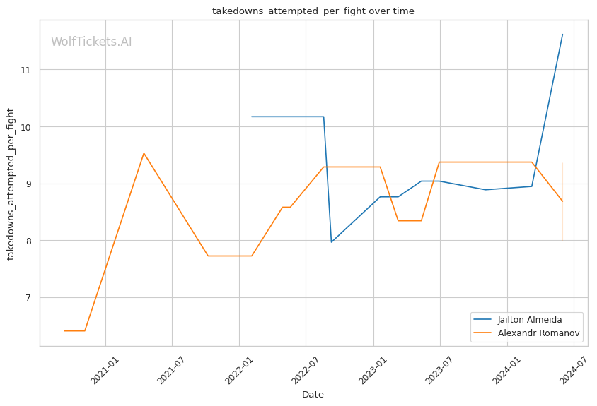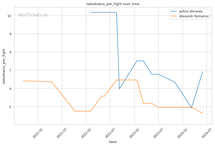 While a skilled grappler in his own right with 0.86 submission wins per UFC fight and 4.32 takedowns landed per fight, Romanov absorbs 2.05 significant strikes per minute, compared to just 1.08 for Almeida, making him more hittable in striking exchanges.