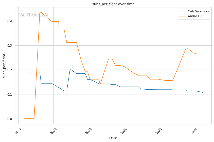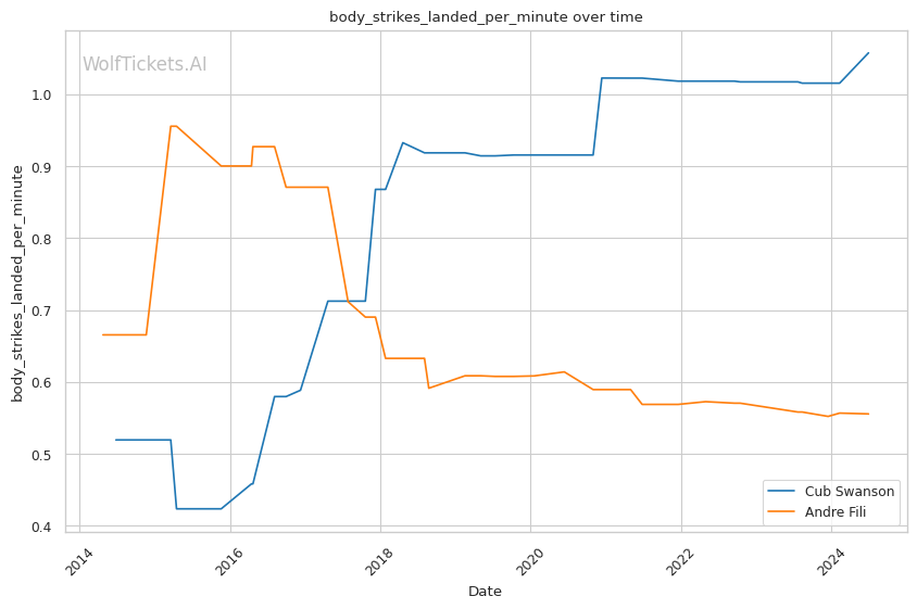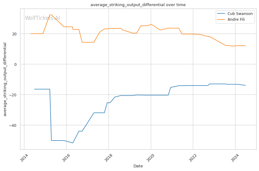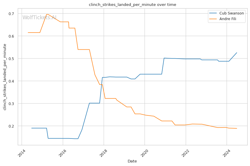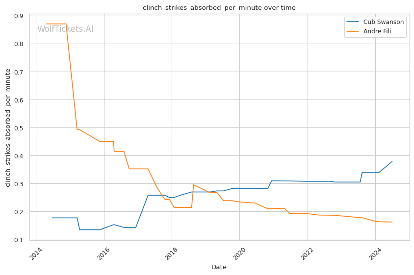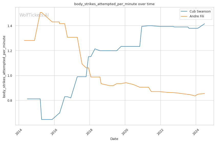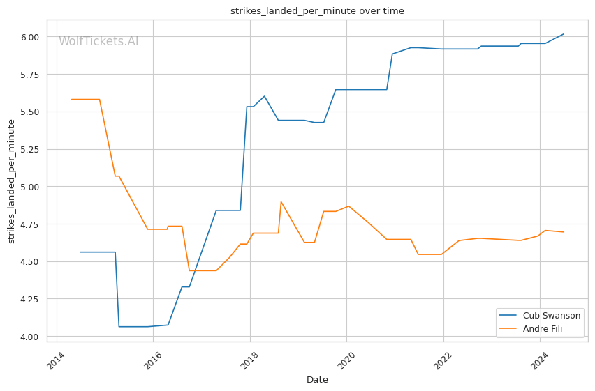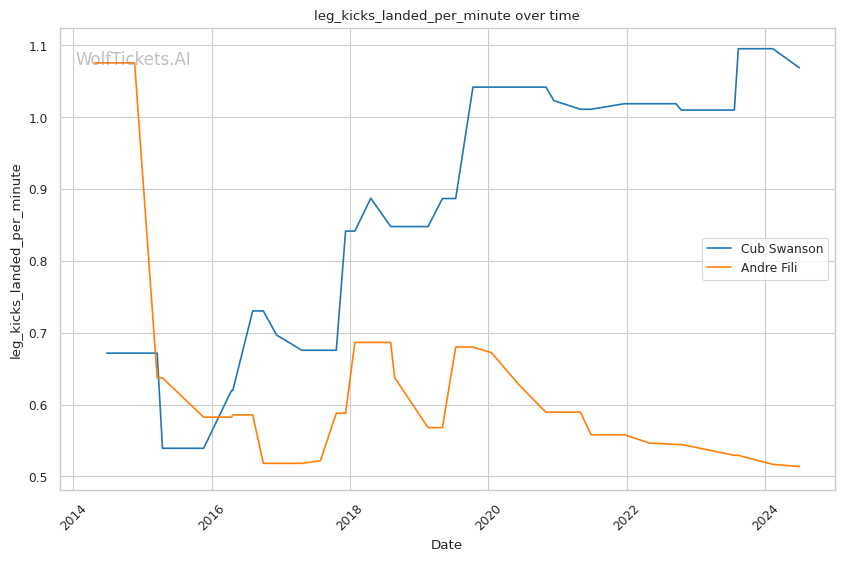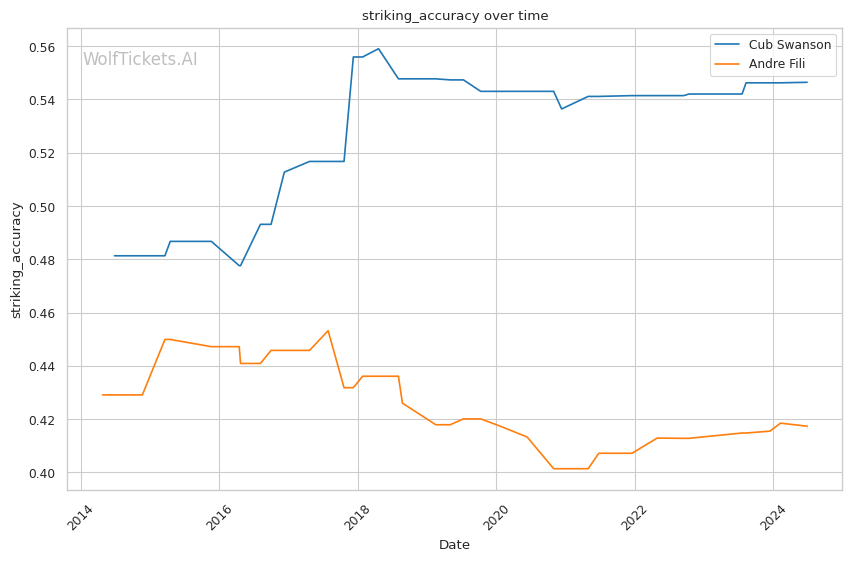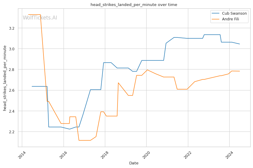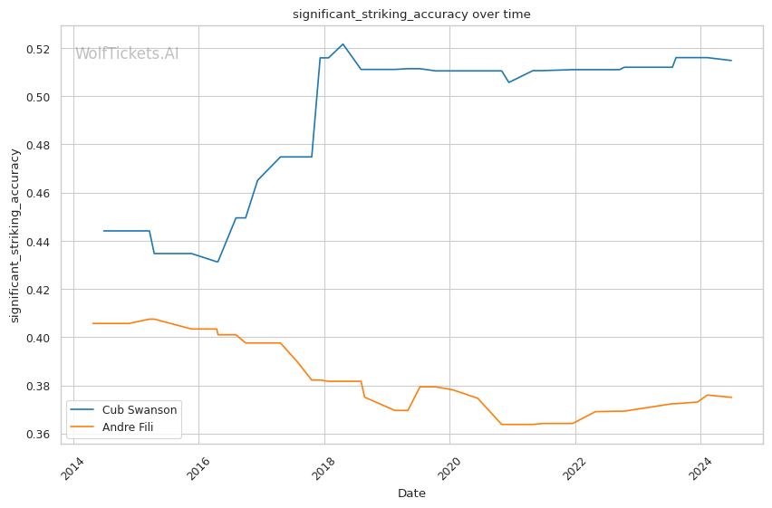 Fili's striking output (3.85 significant strikes landed per minute) is lower than Swanson's, but he compensates with a higher takedown rate of 2.16 per fight. His improved takedown defense in recent bouts adds another layer to his game, potentially nullifying opponents' wrestling advantages.