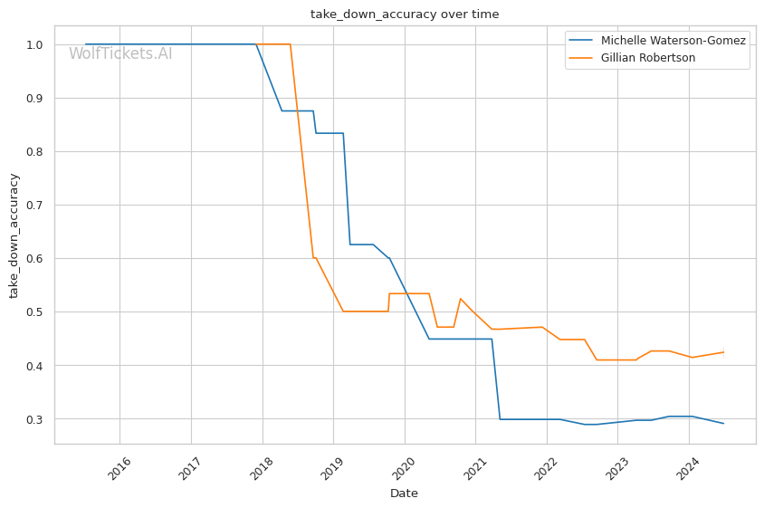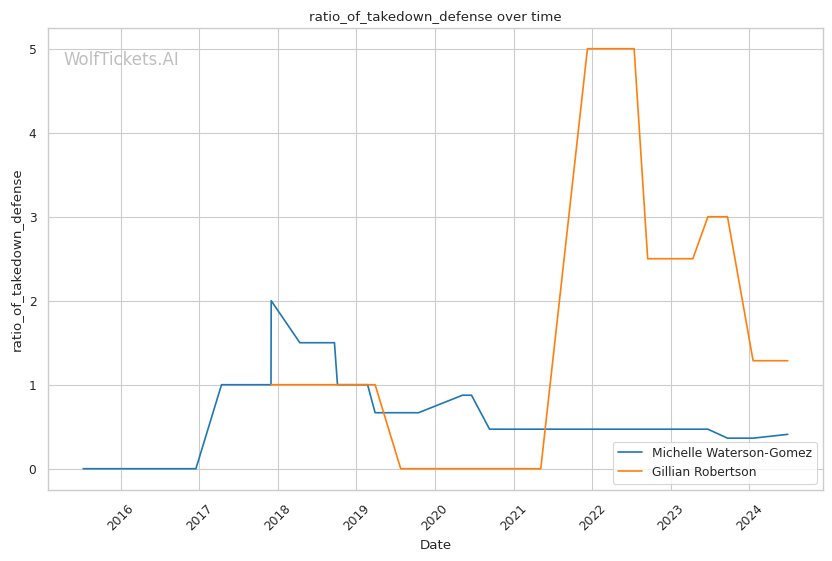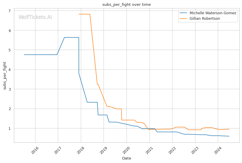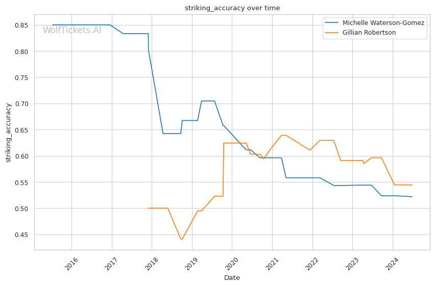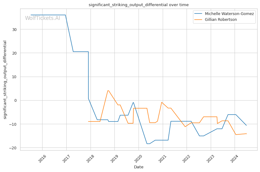 However, recent performances have exposed vulnerabilities. Her takedown defense ratio of 0.4091 is concerning against a submission specialist like Robertson. Waterson-Gomez's recent string of losses, including a KO/TKO defeat to Marina Rodriguez, raises questions about her durability at 38 years old. Her 1-6 record in her last seven fights suggests she may be past her prime, though her losses have often come against top-ranked opponents.