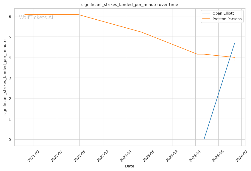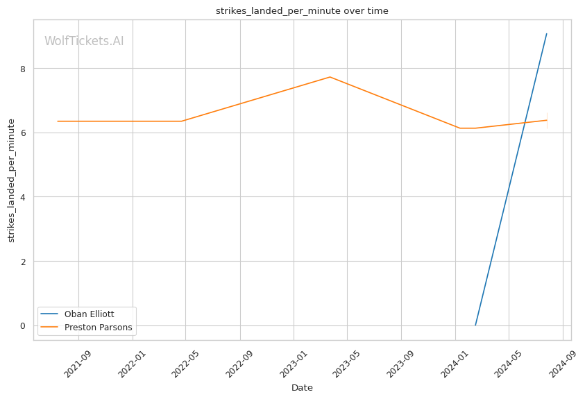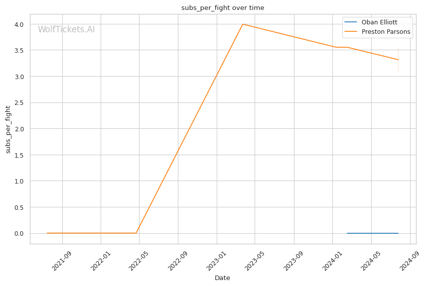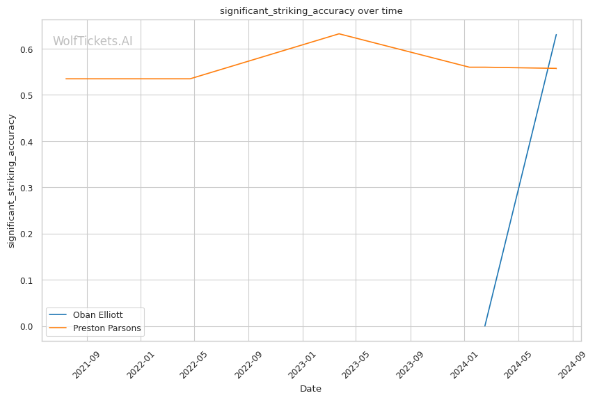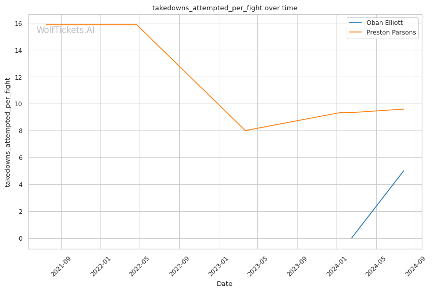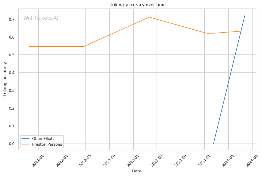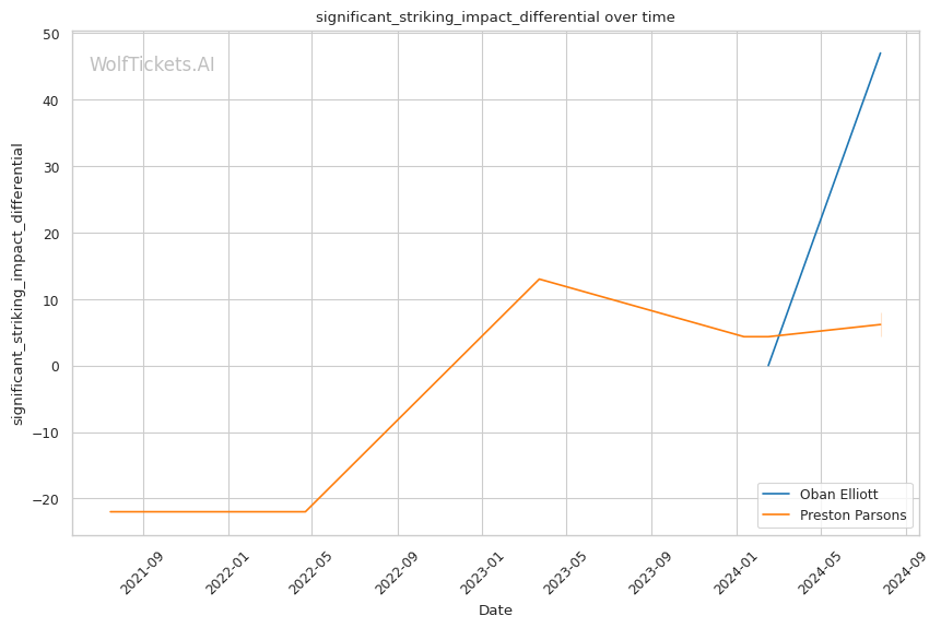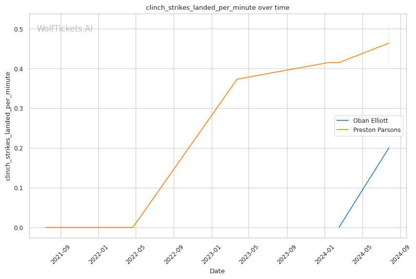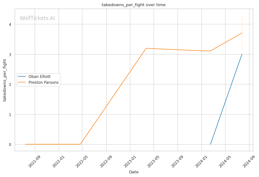 Elliott's grappling-heavy style focuses on position-based control, as evidenced by his successful execution of 3 out of 5 attempted takedowns in his debut. His ability to overcome early adversity, using his grappling to control the fight and threaten submissions, could be a significant factor against Parsons. Elliott's striking defense, while not impenetrable, proved effective with a 62.3% significant striking defense percentage.