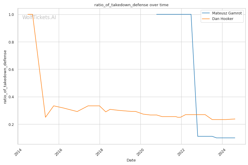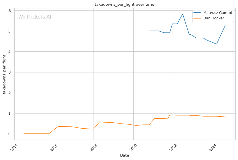Hooker's Takedown Defense: Hooker absorbs 0.92 takedowns per fight and has just a 57% takedown defense rate recently. These stats bode well for Gamrot's grappling-heavy approach.