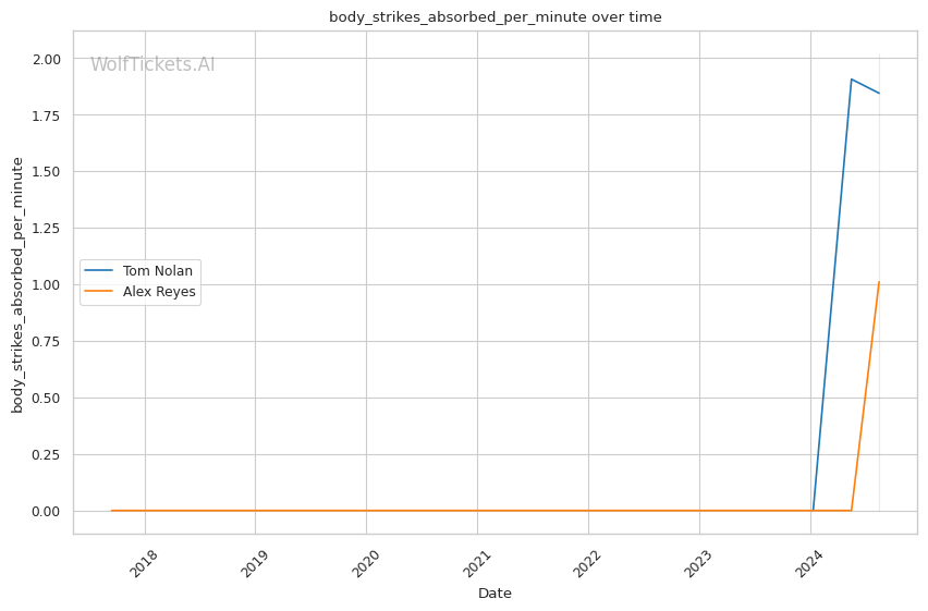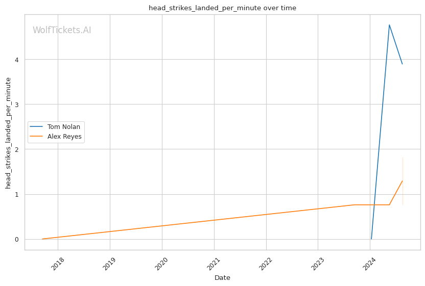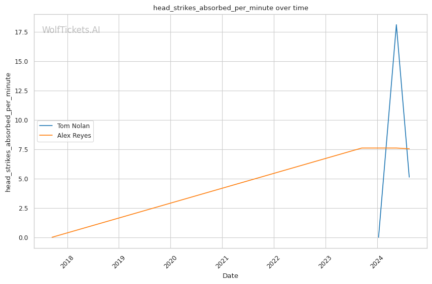 Defensive Liabilities for Reyes: Absorbing 7.47 head strikes per minute while defending under 50% of incoming blows, Reyes courts disaster against a dangerous finisher like Nolan.