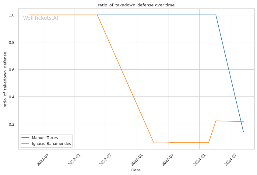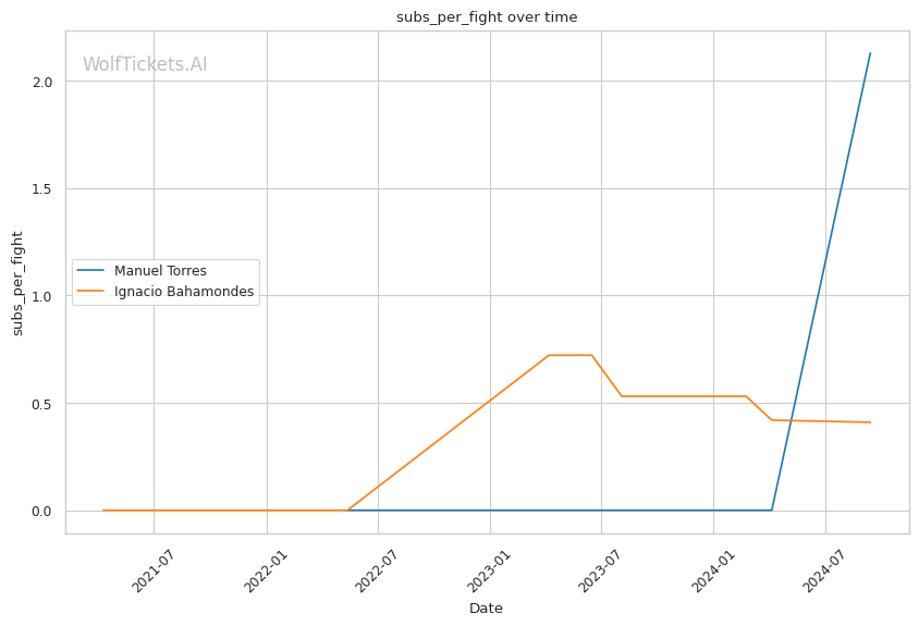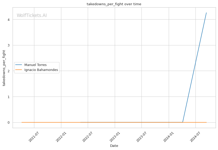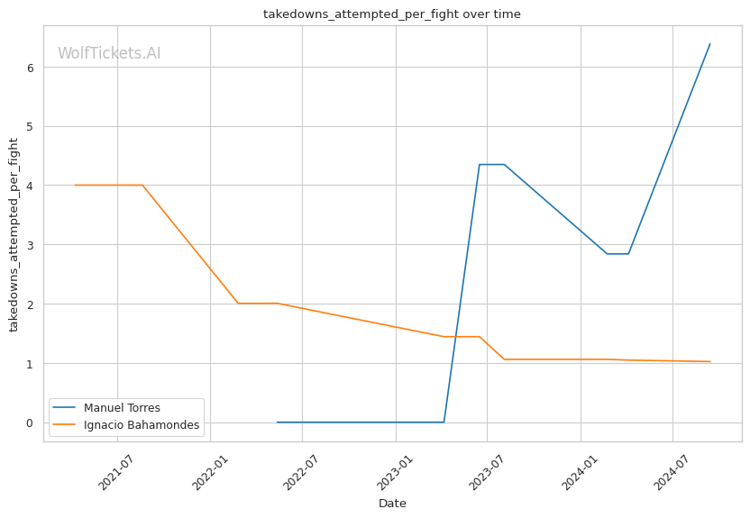 Recent takedowns attempted per fight is one of the few areas Torres has an edge. He's likely going to need to lean on his wrestling to win this fight. If he can't consistently get Bahamondes down, he'll be a sitting duck on the feet.