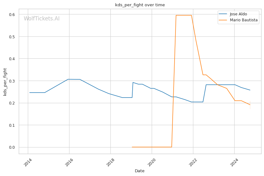 So in summary, the model favors the younger, busier, more well-rounded fighter in Bautista who also appears to be improving rapidly. But Aldo's technical brilliance and vast edge in experience keep it competitive.