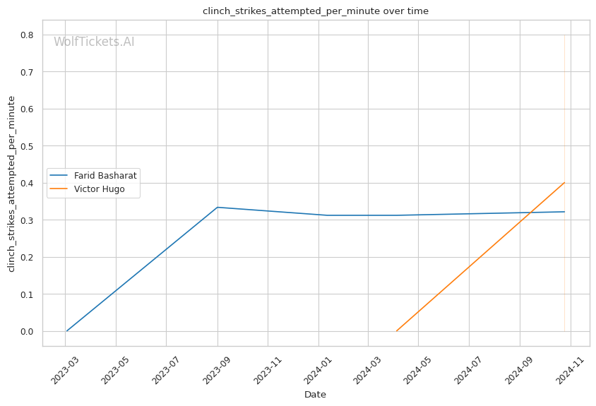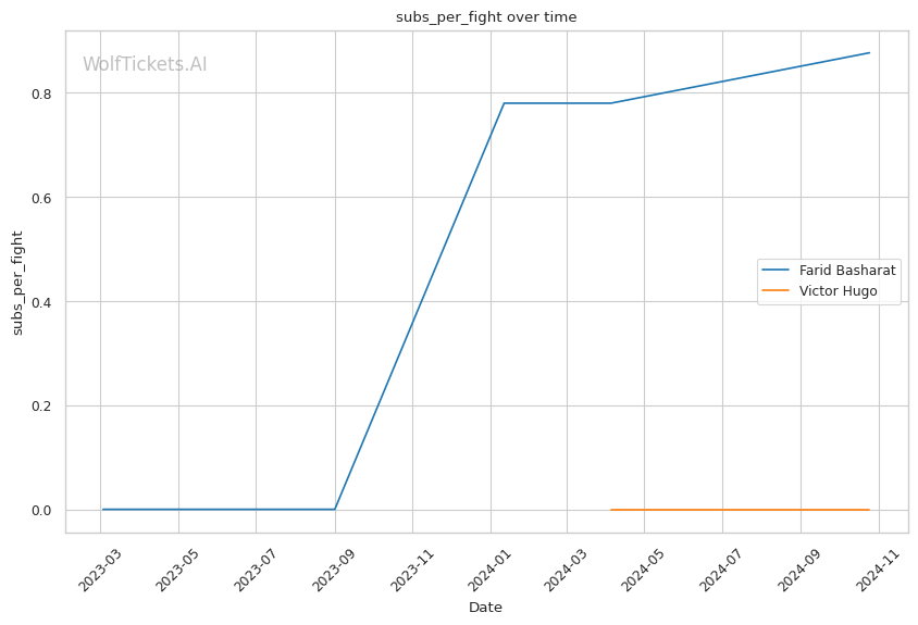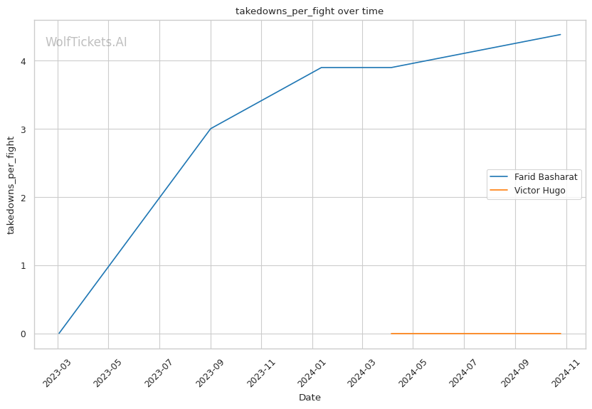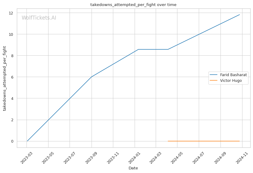 Recent Takedowns Attempted per Fight: Basharat's recent takedown attempts per fight (9.6786) significantly exceed Hugo's (0.0000). This indicates that Basharat is more likely to pursue takedowns and control the fight on the ground.