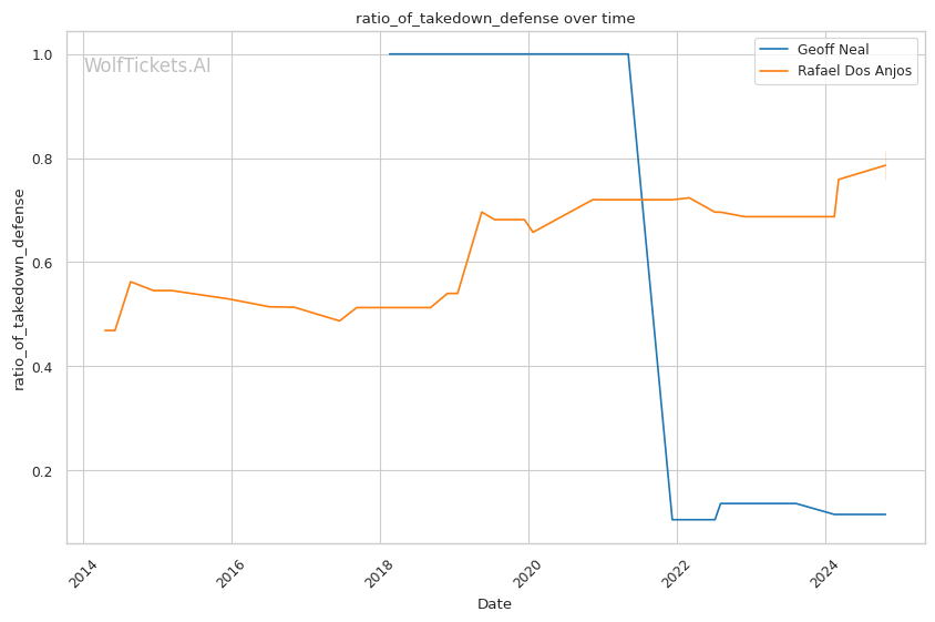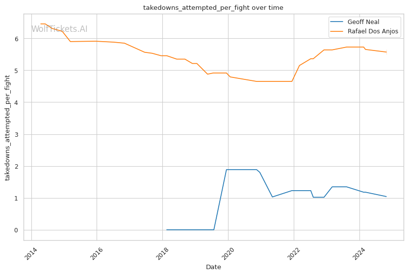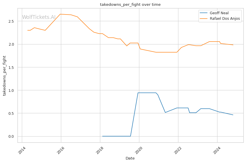 Takedowns Attempted: RDA attempts 5.5 takedowns per fight recently, decreasing Neal's score. The takedown threat is there.