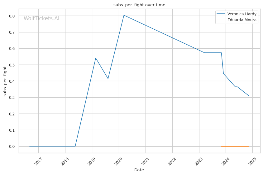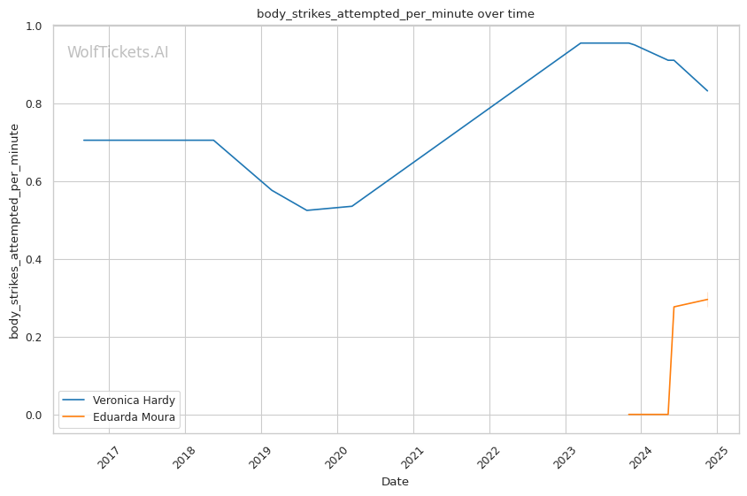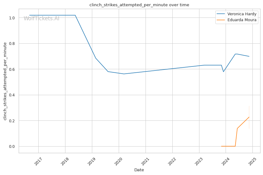 Grappling-wise, Moura attempts a high volume of takedowns, but her success rate suggests she may struggle against opponents with good takedown defense. Her recent performance against Gomes revealed her limitations under sustained aggression, where she struggled to counteract Gomes’ resilience. Moura’s aggression can sometimes lead to openings for counterattacks, a potential weakness that Hardy, with her disciplined approach, could exploit.