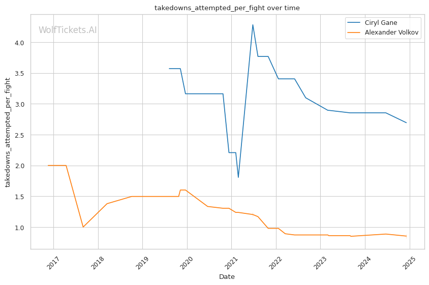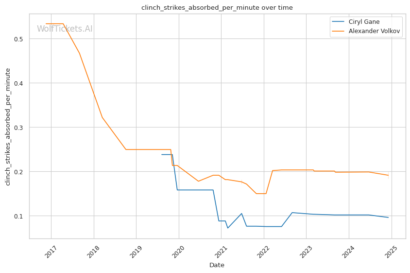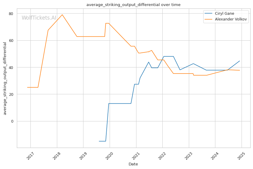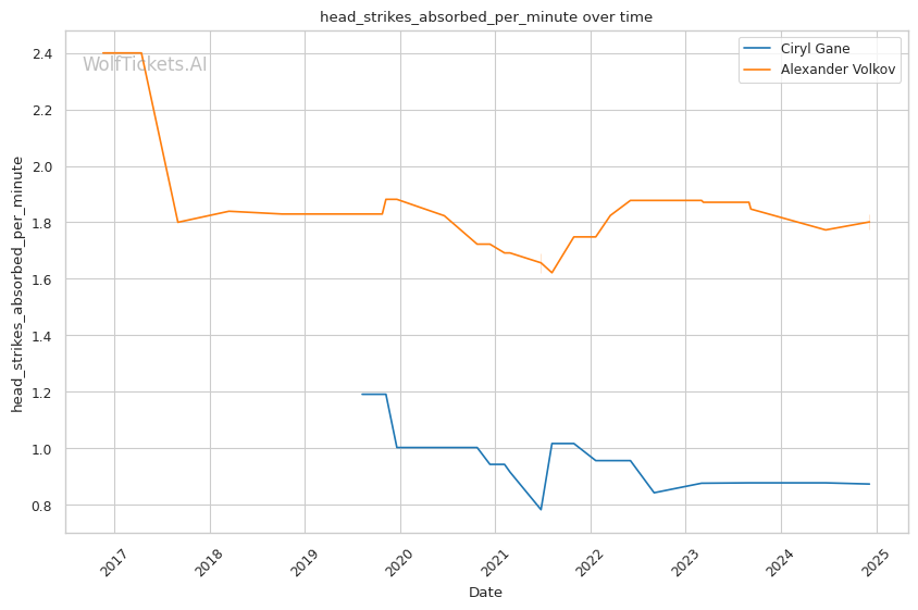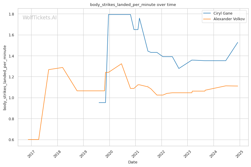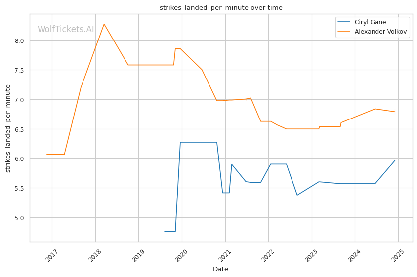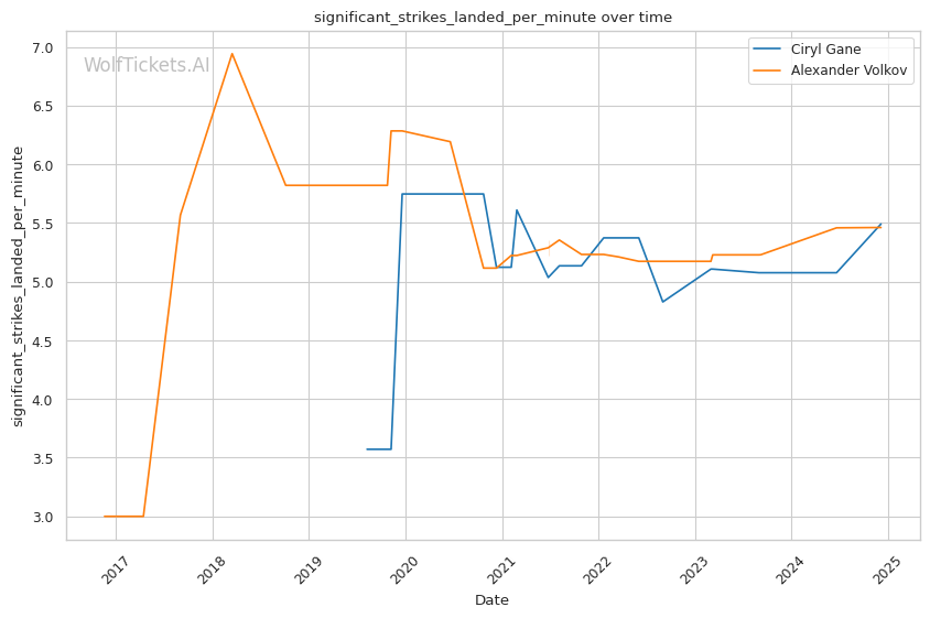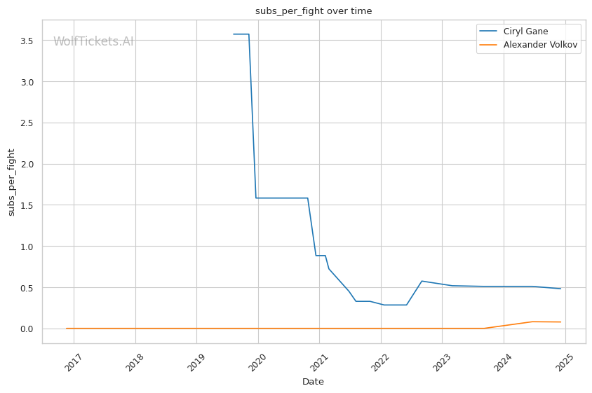 Striking output: While Volkov has a reputation as a volume puncher, Gane actually lands more strikes per minute both overall (5.96 to 5.46) and in their recent fights (6.28 to 5.92). His pace could be a problem for Volkov over 5 rounds.
