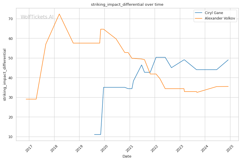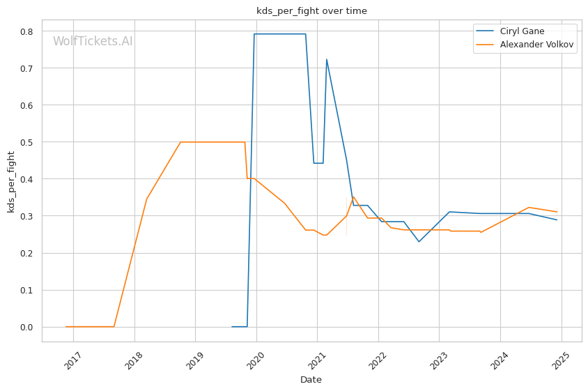 Power and knockdowns: Despite Volkov having a solid knockout record, Gane has a superior knockdown average both overall and recently. His explosive speed and tricky setups lead to more knockdowns.