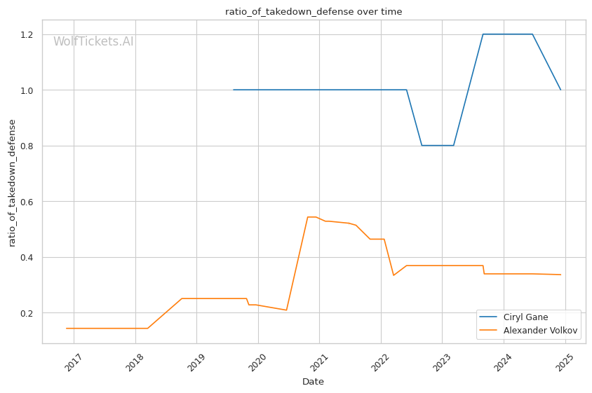 Striking defense: Gane's 60.5% striking defense far exceeds Volkov's 51.5%, a gap that grows even wider in their recent fights (66% to 55.5%). Gane is extremely elusive and Volkov struggles to land clean on faster opponents.