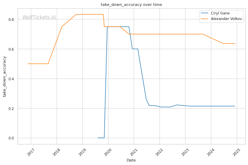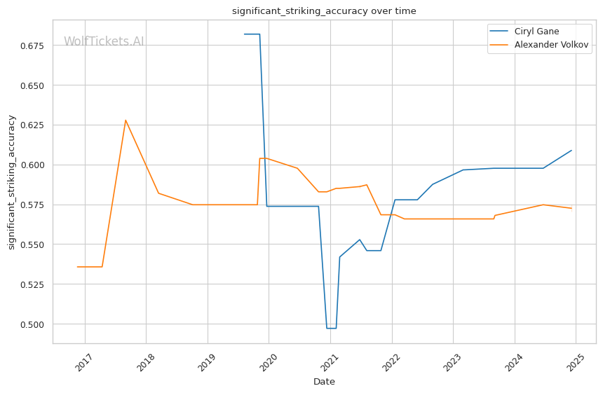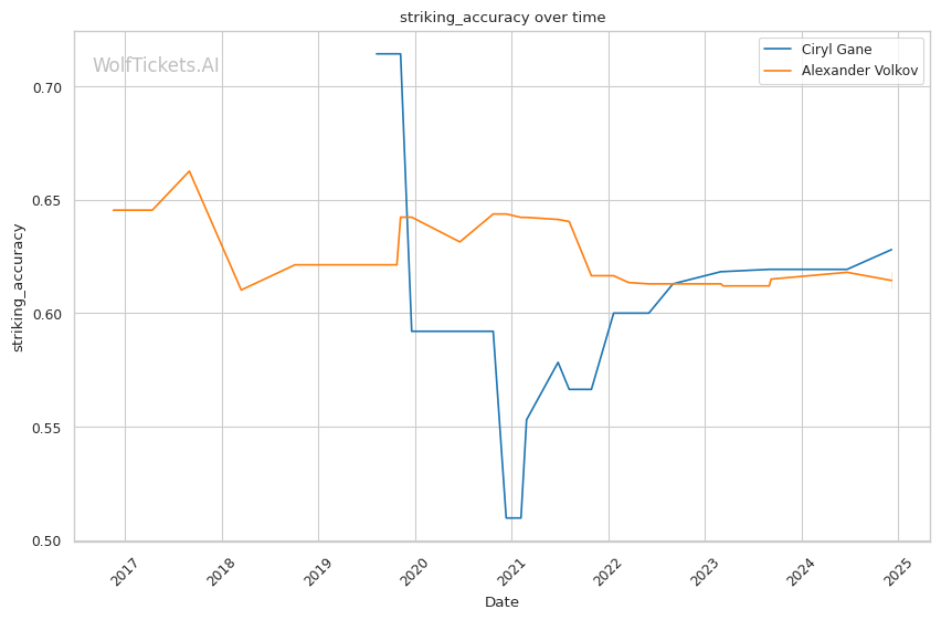 Striking accuracy: Gane has a sizeable edge in striking accuracy, landing at 62.8% to Volkov's 57%. His superior precision was a key factor in their first fight.