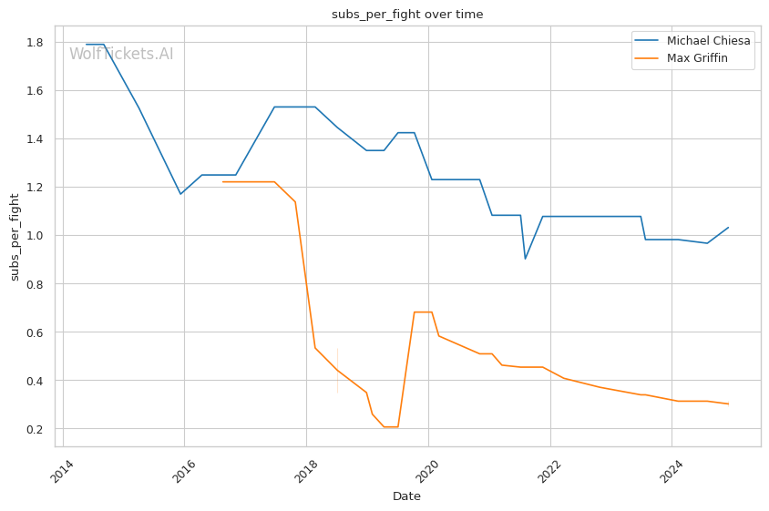 Michael Chiesa's fighting style is highly reliant on his grappling and submission skills. He is known for taking fights to the ground and looking for submissions, primarily rear-naked chokes. His recent fight against Tony Ferguson showcased his adeptness on the ground, where he secured a victory via submission, ending a three-fight losing streak. However, Chiesa has displayed a decline in recent performances with losses to fighters like Vicente Luque and Kevin Holland. His striking defense has been a noticeable weakness, absorbing more strikes than he lands, which might be a vulnerability Griffin can exploit. Chiesa’s recent win percentage and ability to finish fights early with submissions remain critical for his success.