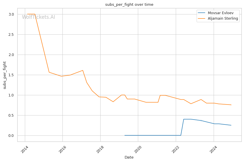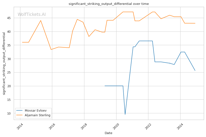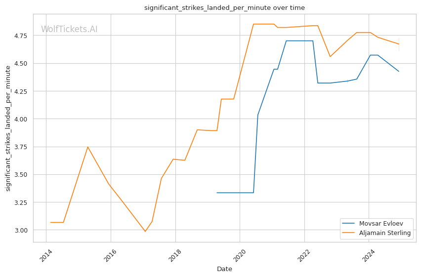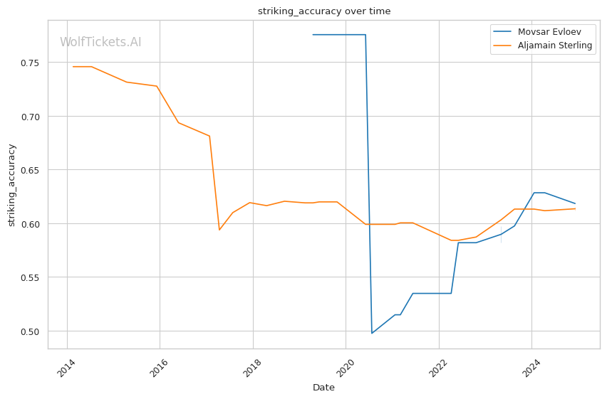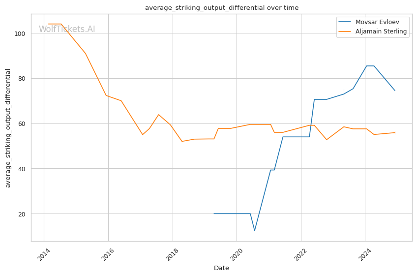 The contrasting prediction histories reflect the difference in each fighter's style - Evloev's consistent wrestling approach has been easier for the model to project compared to Sterling's high risk, high reward submission focused game.