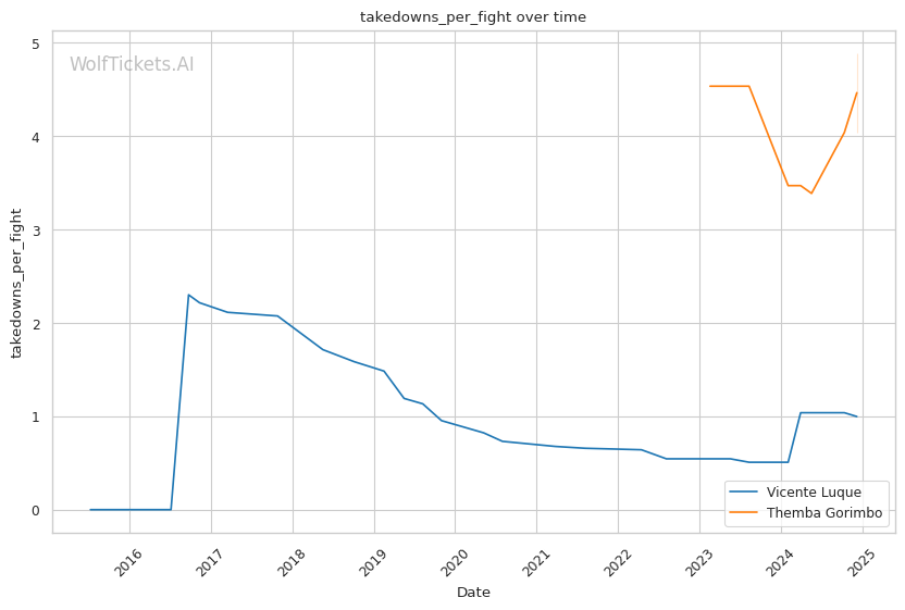 Takedowns Landed per 15 Minutes: Gorimbo’s 4.89 takedowns per fight is a major advantage over Luque’s 0.99.