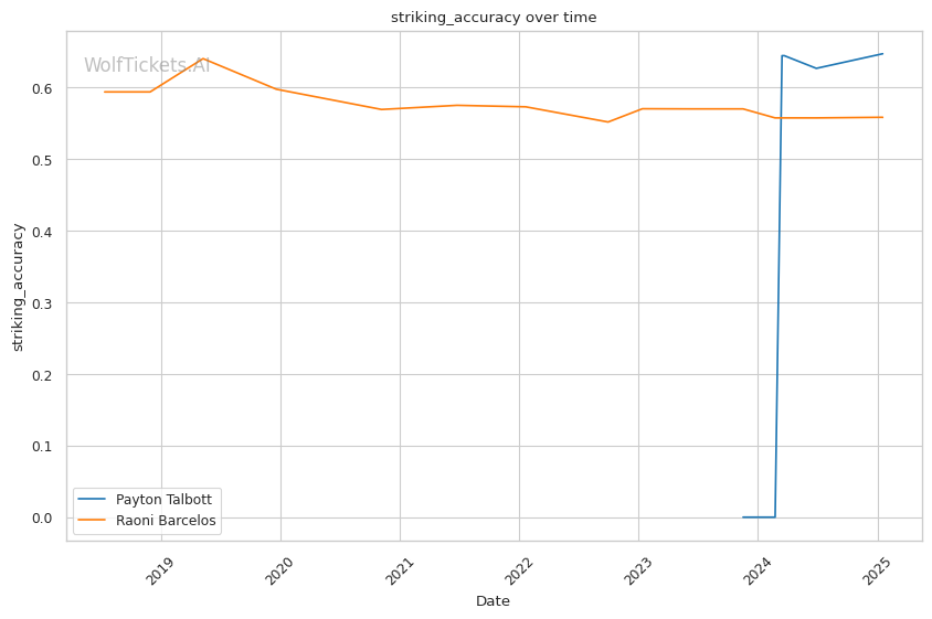 Payton Talbott brings a streak of nine straight wins, including three UFC victories (all finishes). This aggressive finisher has shown powerful striking—19-second KO over Yanis Ghemmouri, a brutal TKO of Cameron Saaiman, and a slick submission against Nick Aguirre. He strings together quick jabs, straight rights, and uses ground-and-pound or submissions if the opponent falls. Opponents who get sloppy with spinning techniques or early wild shots often get smashed. Talbott’s stance switching and intercepting knees also appear regularly. The stats reflect his high-volume style: nearly seven significant strikes per minute and a recent striking accuracy of over 63%. He has avoided knockouts so far and hasn’t tasted defeat. The model has picked Talbott correctly in all previous predictions.