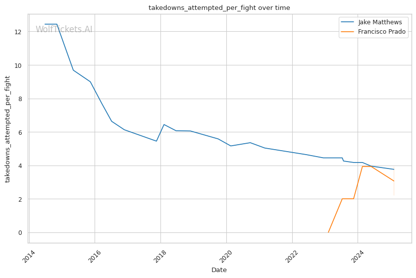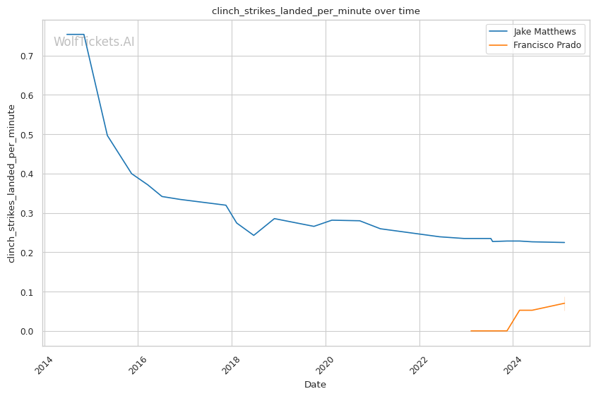 Jake Matthews is expected to control this fight with his blend of strategic striking and defensive grappling, effectively neutralizing Francisco Prado's aggressive yet often reckless stand-up game. WolfTicketsAI backs Matthews decisively in this matchup.