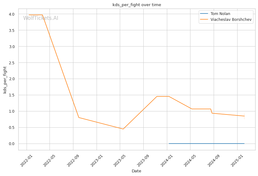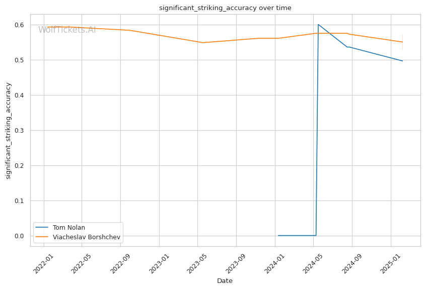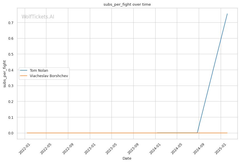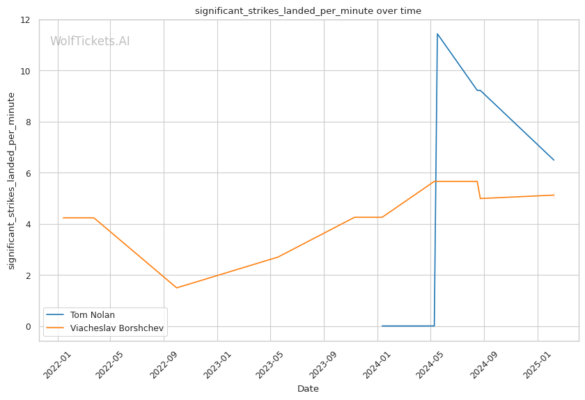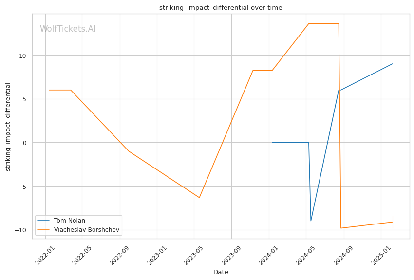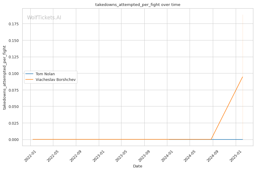 Expect Tom Nolan to capitalize on his reach and aggression, using his defensive improvements to withstand Borshchev's striking while exploiting grappling weaknesses. WolfTicketsAI firmly sides with Nolan for this bout.