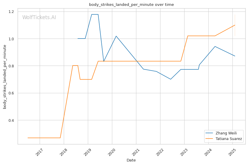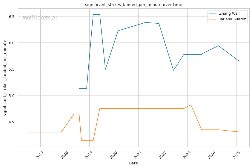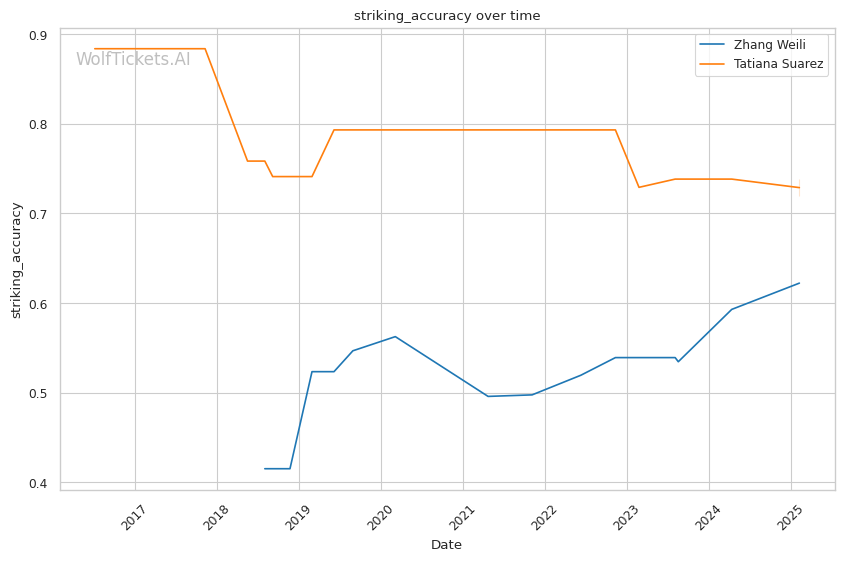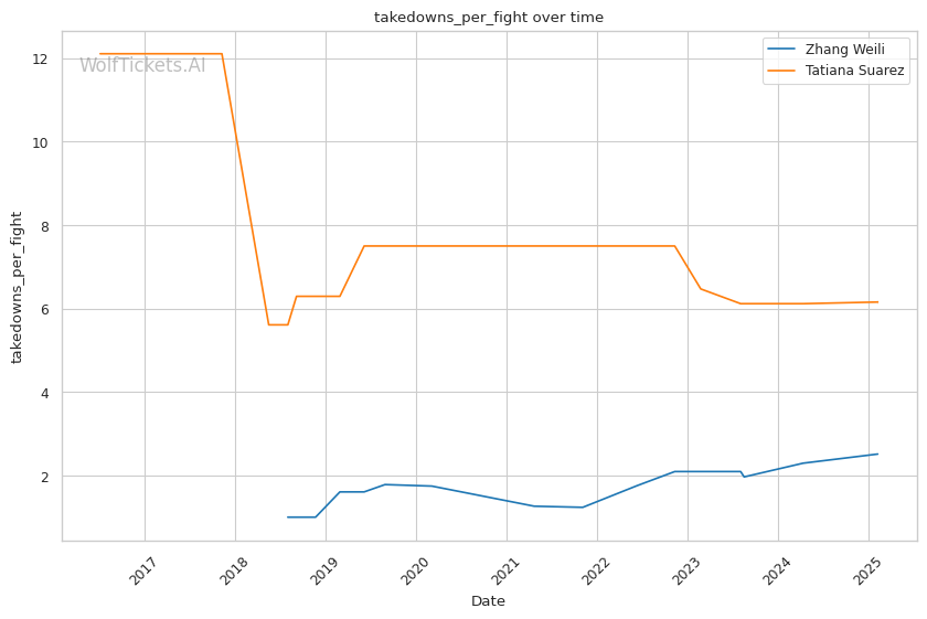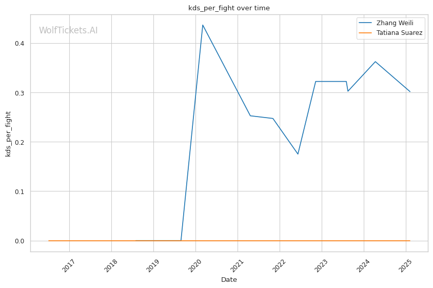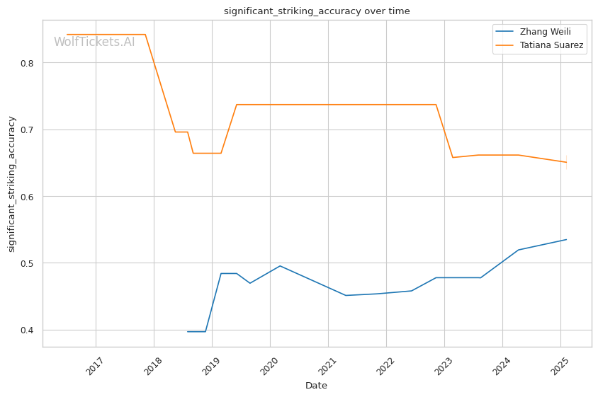 WolfTicketsAI has a strong track record with Zhang Weili, correctly predicting her wins against Yan Xiaonan, Amanda Lemos, and Carla Esparza. The model has confidently backed Weili in previous bouts and sees this matchup similarly. For Tatiana Suarez, the model accurately foresaw her victories over Jessica Andrade and Montana De La Rosa, although her fewer bouts relative to Weili suggest minor uncertainty in comparison.