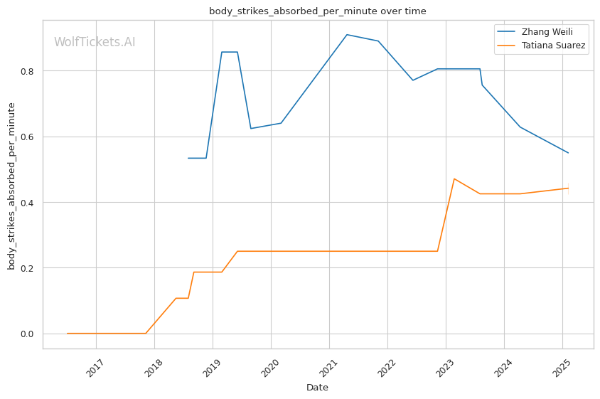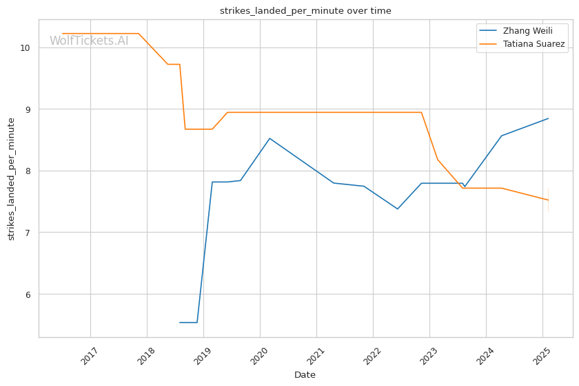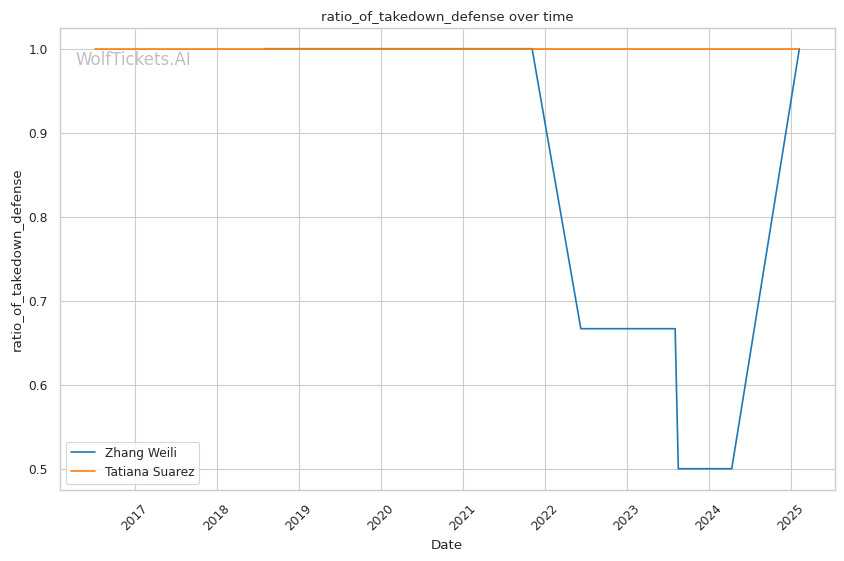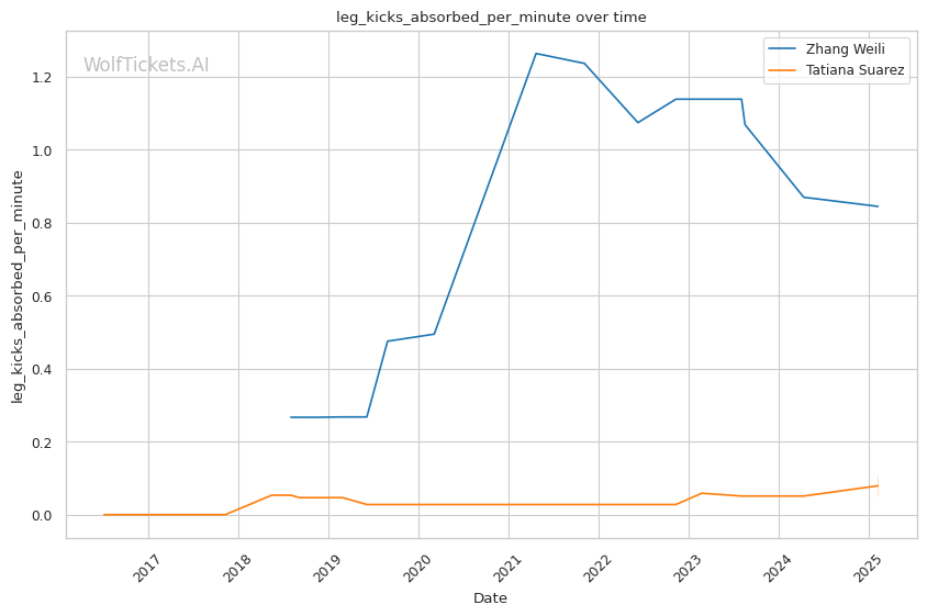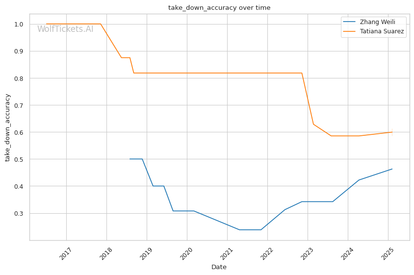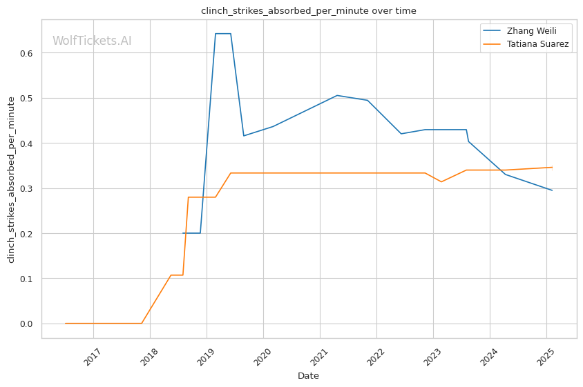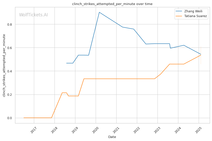 WolfTicketsAI has a strong track record with Zhang Weili, correctly predicting her wins against Yan Xiaonan, Amanda Lemos, and Carla Esparza. The model has confidently backed Weili in previous bouts and sees this matchup similarly. For Tatiana Suarez, the model accurately foresaw her victories over Jessica Andrade and Montana De La Rosa, although her fewer bouts relative to Weili suggest minor uncertainty in comparison.