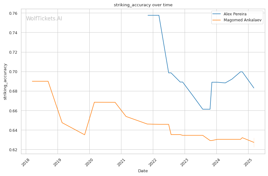 For Ankalaev, the model has been mostly accurate, correctly predicting his wins over Aleksandar Rakic, Johnny Walker, and Anthony Smith. The model has maintained a solid track record with both fighters, though its higher confidence in Pereira suggests it sees clear advantages for the champion.
