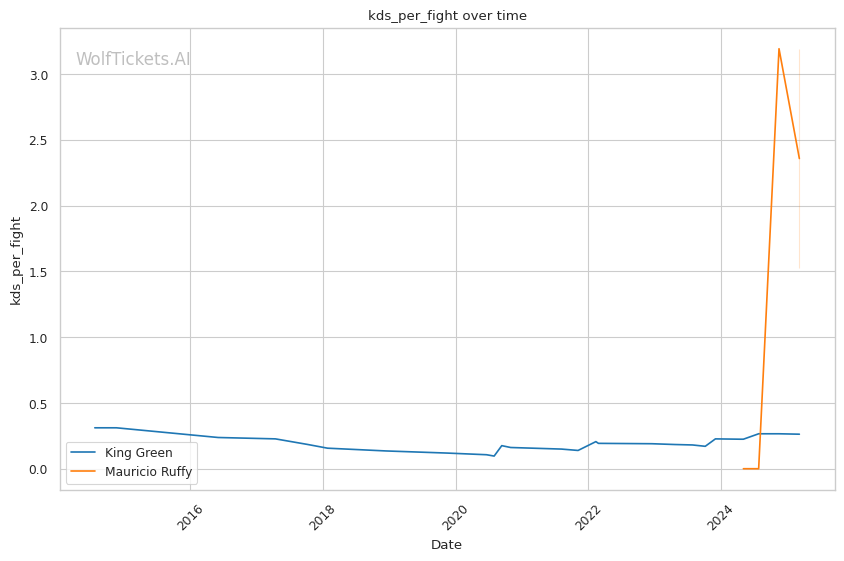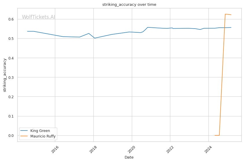 While King Green brings substantially more UFC experience to this matchup, Mauricio Ruffy's superior striking metrics, defensive skills, and physical advantages give him clear pathways to victory. Green's increasingly predictable defensive patterns and recent vulnerability to fighters who can maintain distance make this a particularly challenging stylistic matchup for him. WolfTicketsAI's prediction of Ruffy takes into account both fighters' recent performances and key statistical advantages, making him the justified favorite to extend his impressive UFC run.