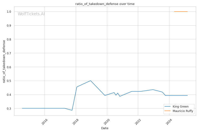 The statistics tell a clear story: Ruffy averages 1.52 knockdowns per fight compared to Green's 0.26, highlighting his significant power advantage. His defensive skills are equally impressive, maintaining a 100% takedown defense ratio against opponents' attempts. Ruffy fights at a strategic pace, landing 4.67 significant strikes per minute with 60% accuracy, all while absorbing minimal damage.