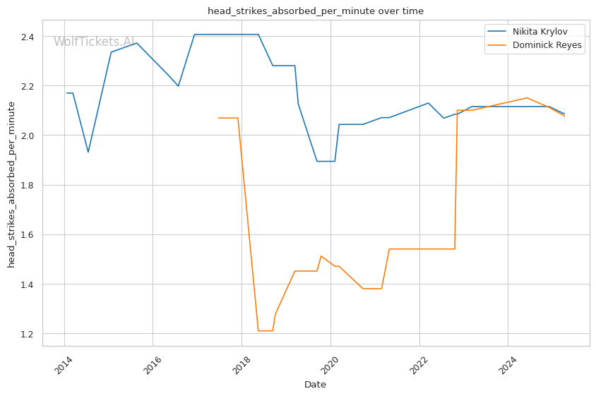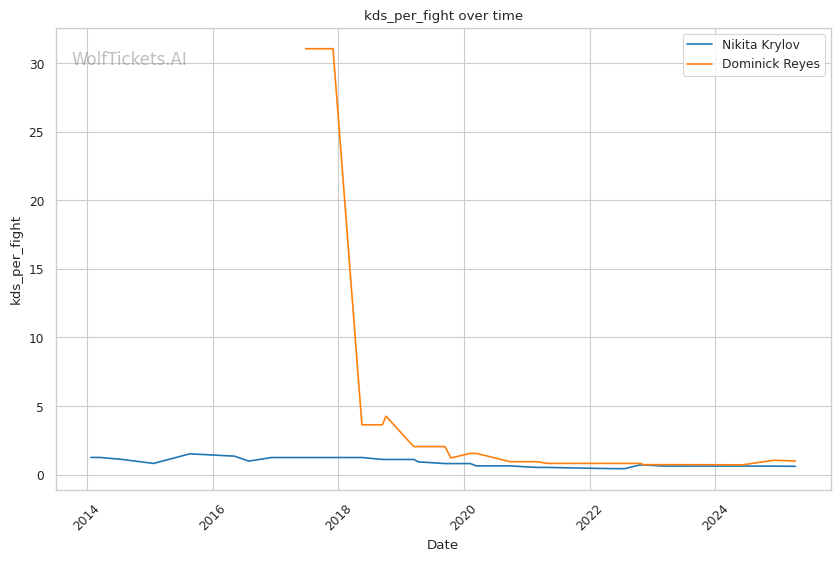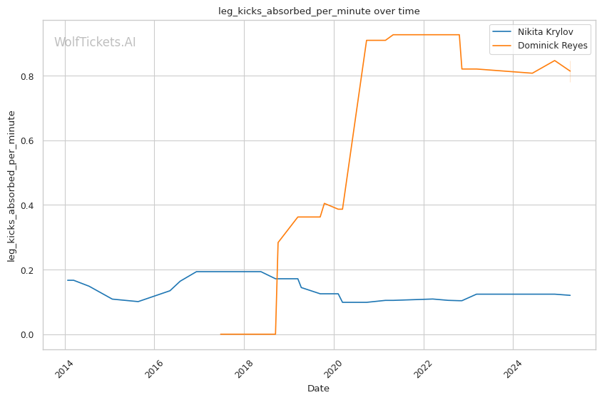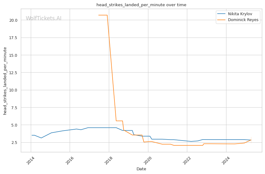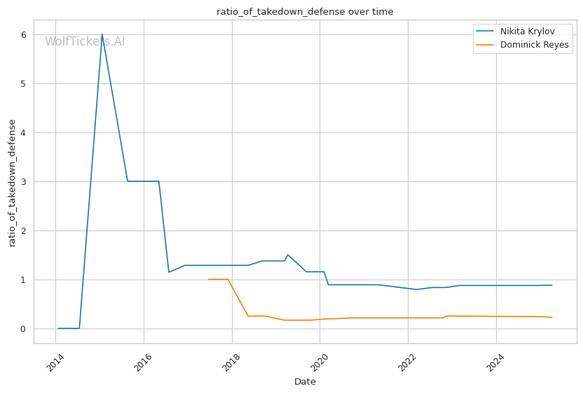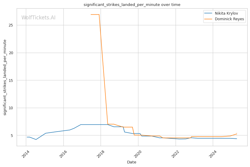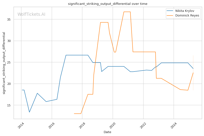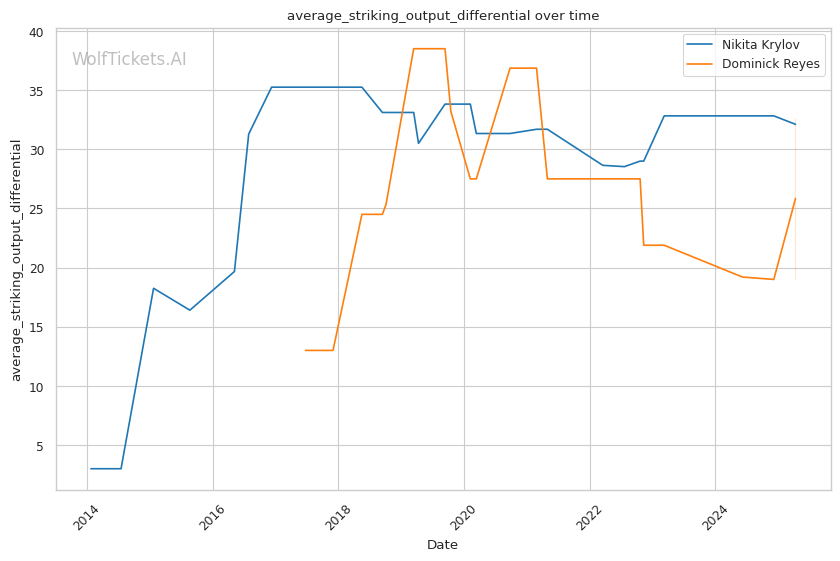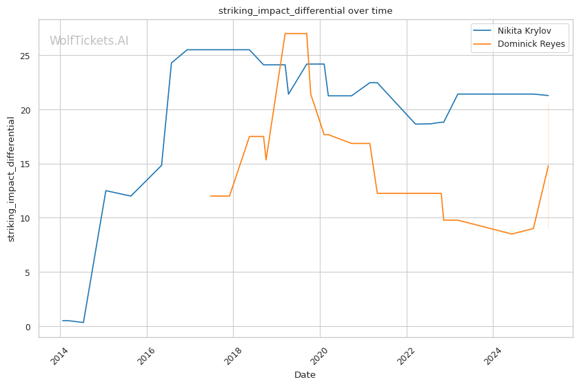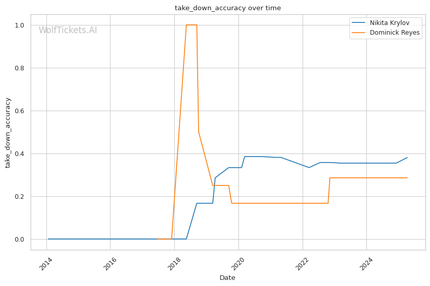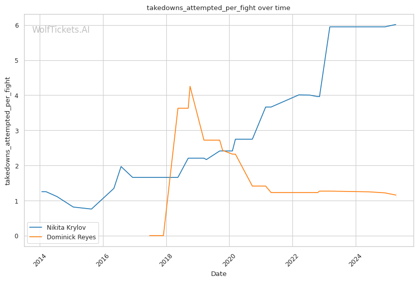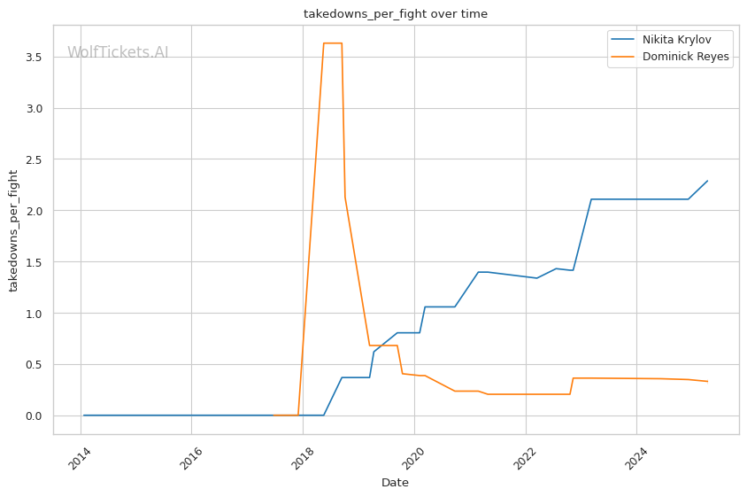 Takedown differential: Krylov attempts 6.01 takedowns per fight compared to Reyes's 1.09, suggesting Krylov will likely look to mix in wrestling to neutralize Reyes's counter striking.