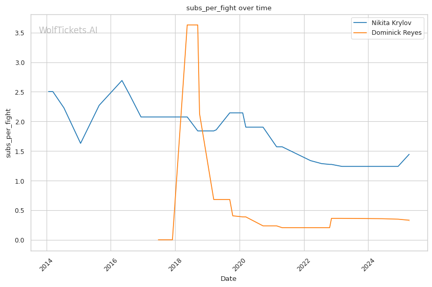 Submission threat: Krylov's 1.44 submissions per fight presents a serious threat to Reyes, who primarily wants to keep the fight standing.