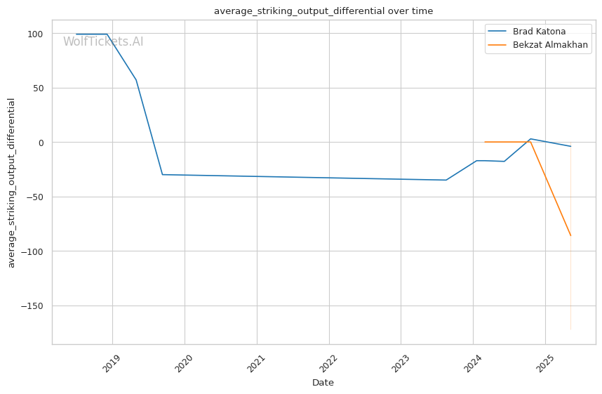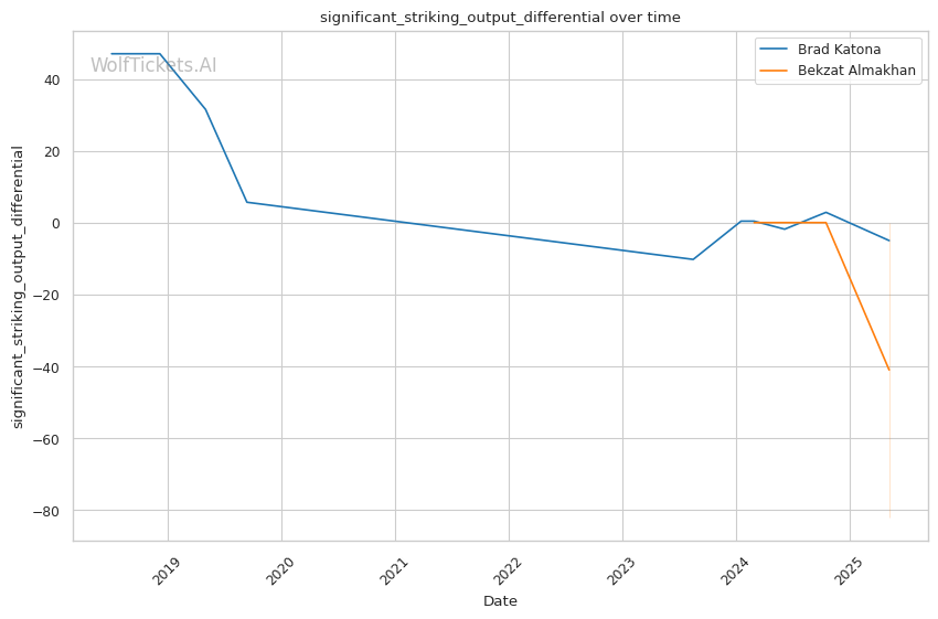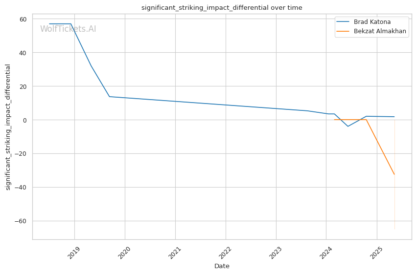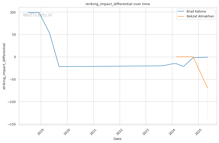 Striking differential is key: Katona's significant striking impact differential (+1.75) contrasts sharply with Almakhan's (-65.0), suggesting Katona will control the striking exchanges.