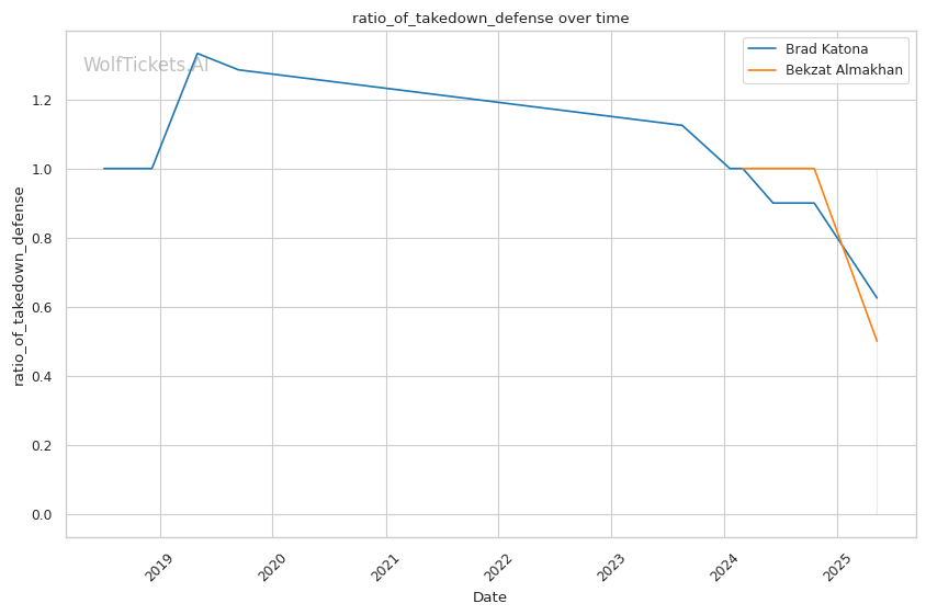 Defensively, Almakhan showed impressive ground survival skills against Nurmagomedov's dominant top pressure. He executed well-timed bridges when mounted and created scrambles to improve position. His ability to recover and get back to his feet will be tested against Katona's grappling.