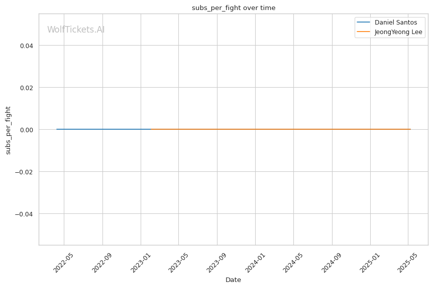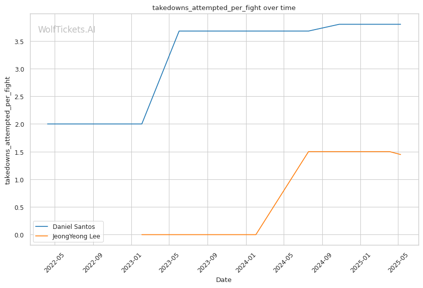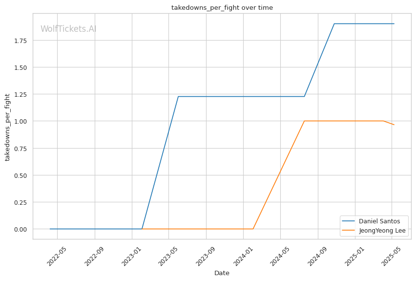 Santos averages 1.9 takedowns per fight with a 50% accuracy rate, showing he's not afraid to mix in wrestling when needed. His recent fights show he's attempting 4.18 takedowns per fight, indicating an increasing willingness to use his grappling.