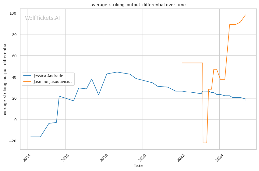 Jasudavicius presents a stylistic nightmare for the current version of Andrade. Her size advantage, relentless pressure, and superior cardio will likely neutralize Andrade's diminishing physical gifts. Expect Jasudavicius to weather early storms, gradually wear down Andrade with clinch work and takedowns, and either secure a late submission or dominant decision. WolfTicketsAI's prediction of a Jasudavicius victory appears well-founded given Andrade's recent decline and Jasudavicius's momentum.