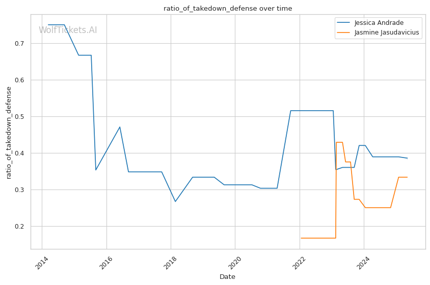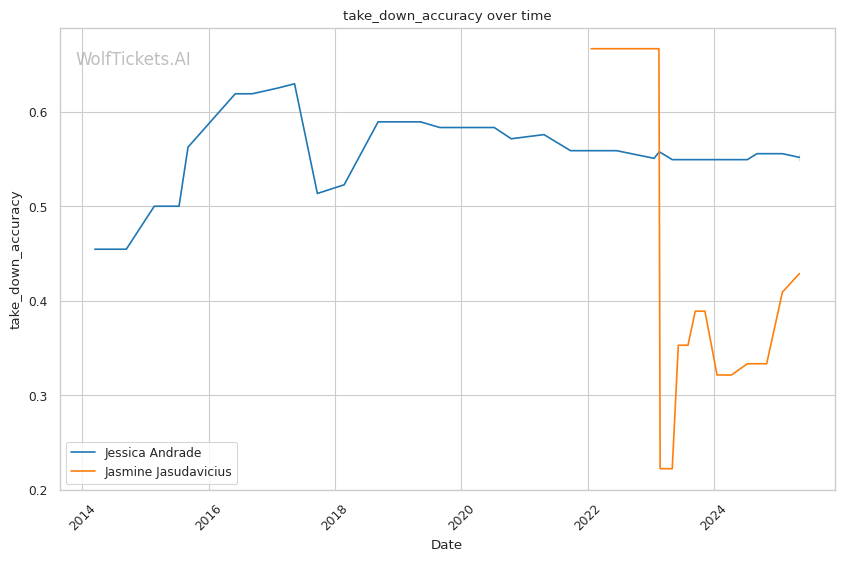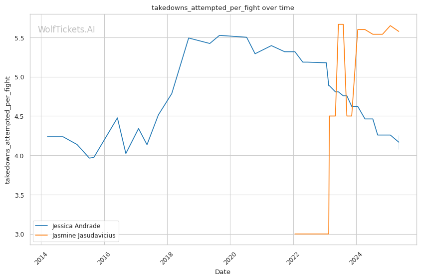 Jasudavicius effectively uses her 5'7" frame and 68" reach (6" reach advantage over Andrade) to control distance before initiating clinch exchanges. Her takedown game, while not always technically perfect with just a 42% accuracy rate, is persistent - she averages 5.5 takedown attempts per fight and eventually wears opponents down through sheer determination.