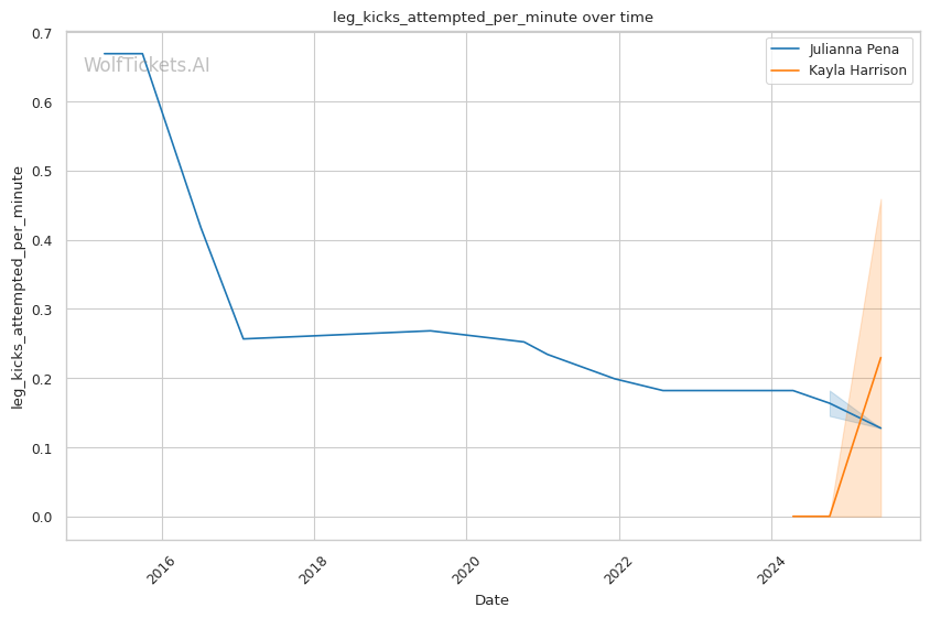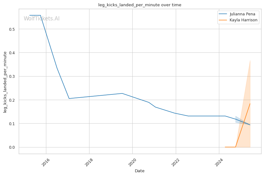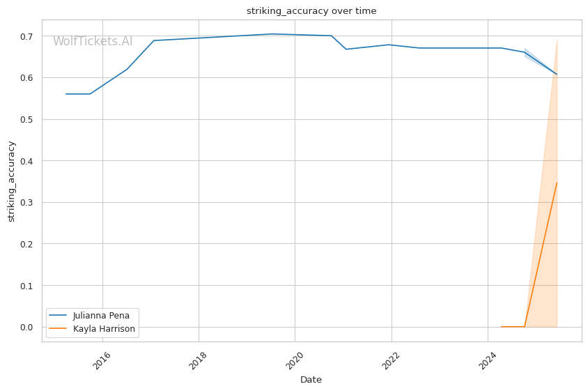 WolfTicketsAI has a mixed record predicting these fighters. The model correctly predicted Amanda Nunes would defeat Pena in their rematch but incorrectly predicted Raquel Pennington would defeat Pena in their recent title fight. With limited data on Harrison in the UFC, the model's confidence in this prediction should be viewed with some caution.