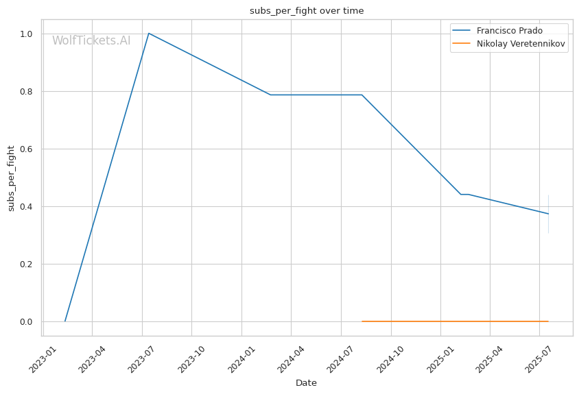 WolfTicketsAI has a mixed record with Prado, correctly predicting against him in losses to Matthews and Zellhuber, but successfully backing him in the Azaitar knockout. The model hasn't previously predicted Veretennikov, creating some uncertainty around his UFC debut and subsequent performance patterns.